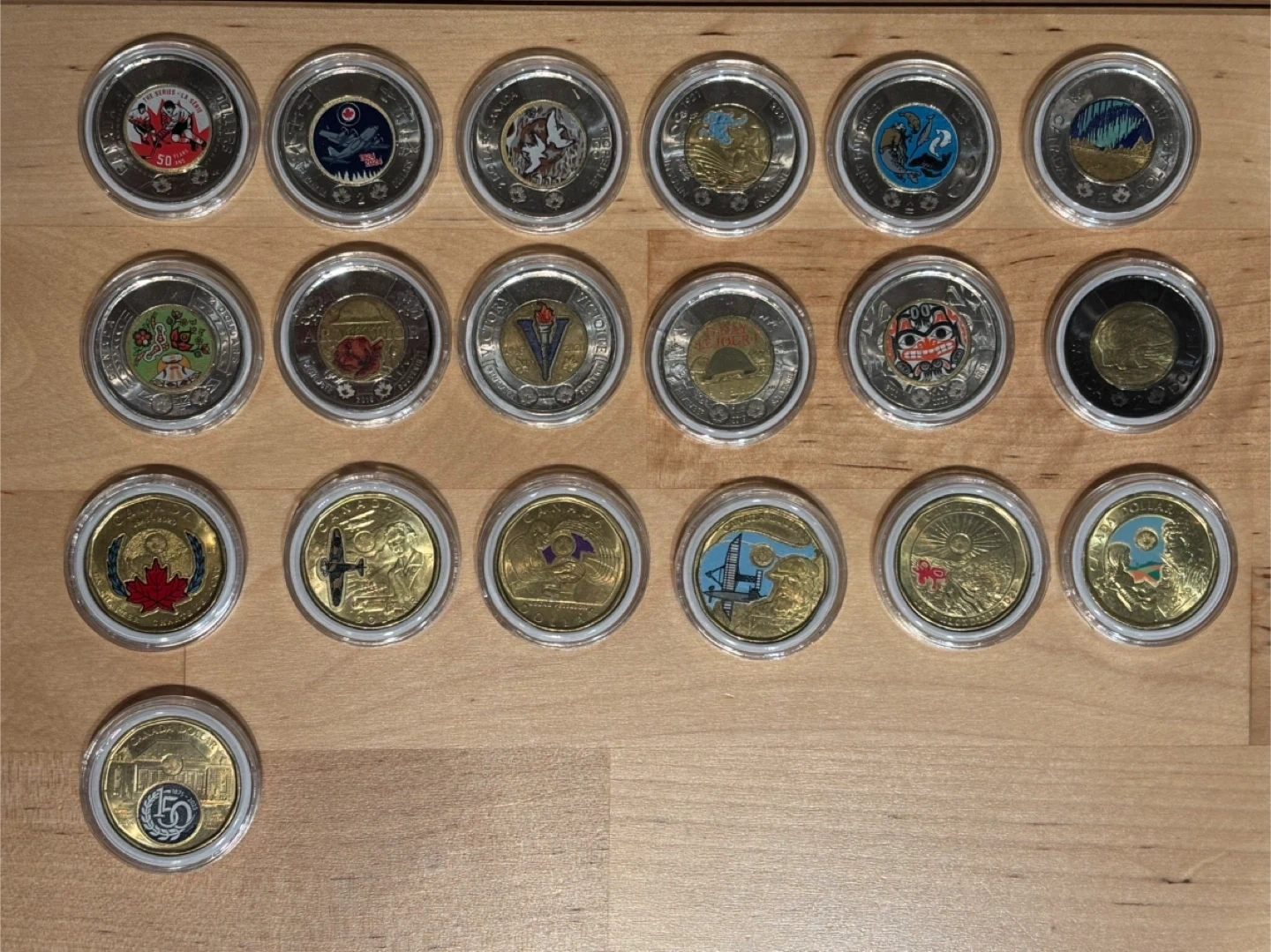Start your coloured coin collection here. Hard to find. All coins come encased with inner foam lining to prevent movement. Anniversary of the “Summit Series” $4 Royal Canadian Air Force $7 Jean Paul Riopelle $4 Discovery of Insulin $7 Celebrating Inuit Nunangat $7 Dance of the Spirits $30 Armistice Centennial $7 End of the Second World War $7 D-Day 75th Anniversary $7 Bill Reid $7 Black Ring - honoring Queen Elizabeth II $3 National Indigenous Peoples Day $7 United Nations $3 Elsie MacGill $3 Oscar Peterson $3 Alexander Graham Bell $3 Klondike Gold Rush $3 Lucy Maude Montgomery $3 The Supreme Court of Canada $5 *also have the non coloured version of these coins if interested. Priced individually or take them all for $100.