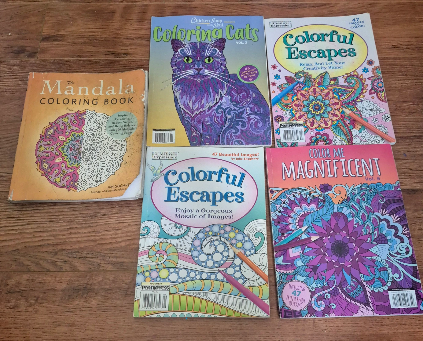 Selling a bundle of lightly used colouring books! Includes titles like 'The Mandala Coloring Book' by Jim Gogart, 'Chicken Soup for the Soul Coloring Cats Vol. 2', 'Colorful Escapes' by Julia Snegirevy, and 'Color Me Magnificent Vol. 6' Each book has unique designs to help you relax and get creative