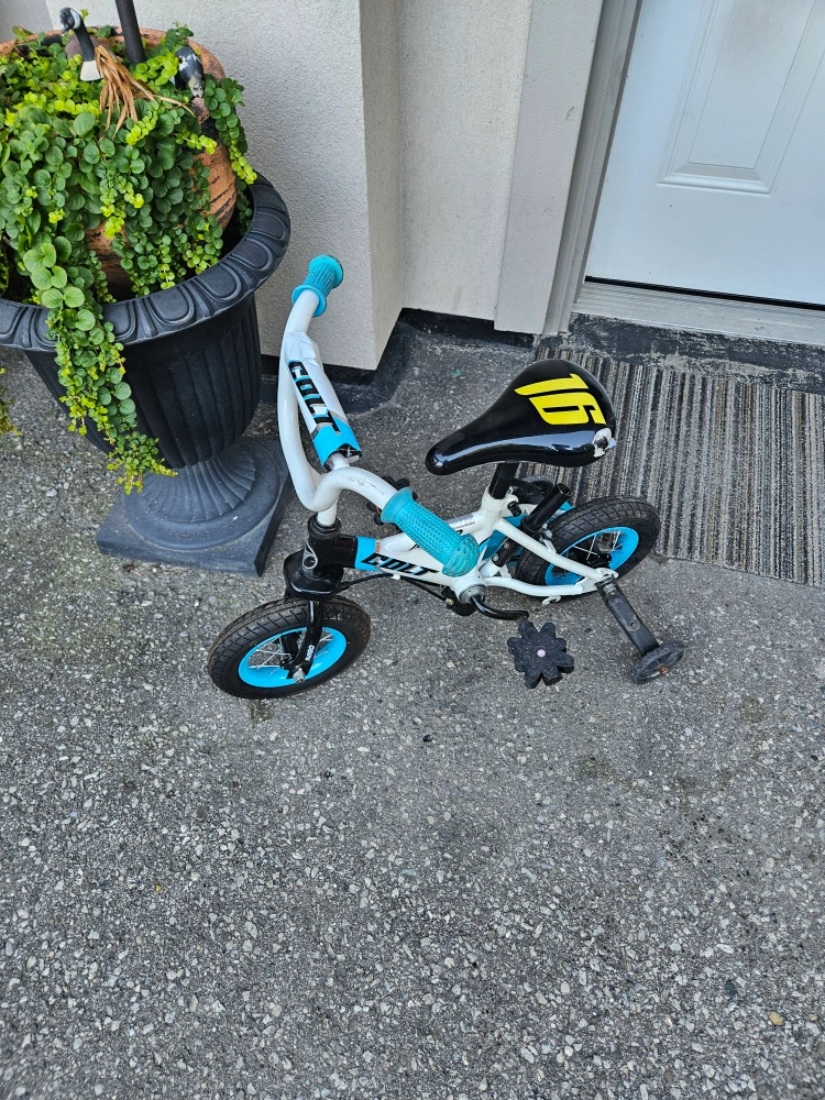 This Colt balance bike is perfect for kids learning to balance! It features a blue and white colour scheme. The tires are 10x2.