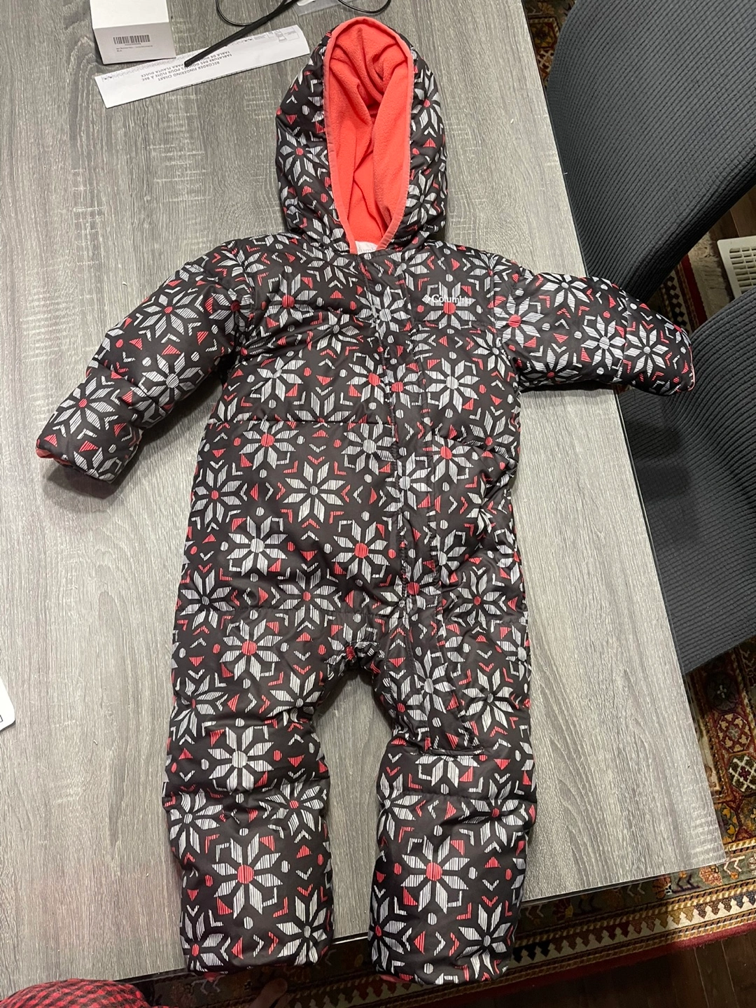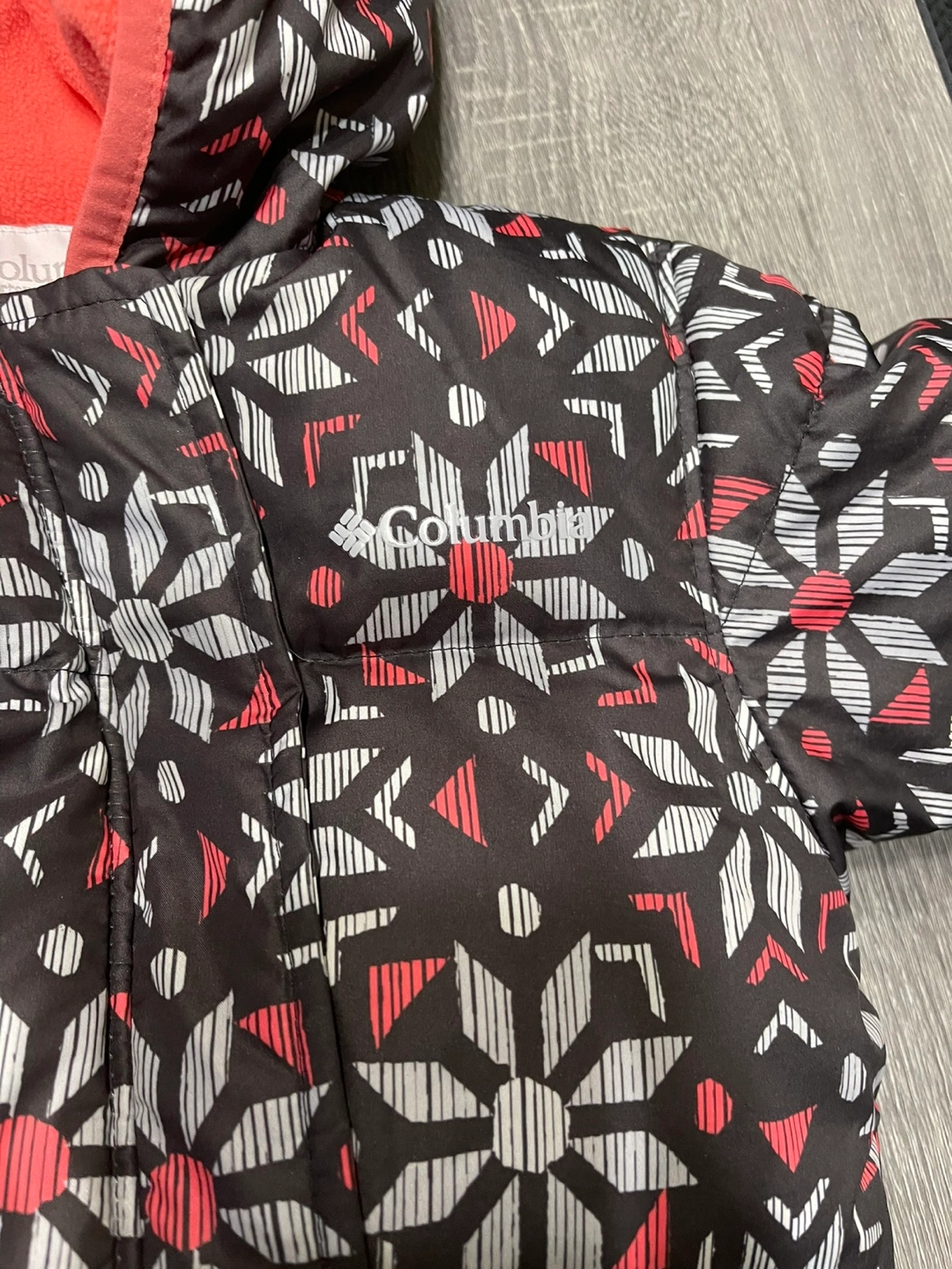 Adorable Columbia baby snowsuit. Size 18-24 months. Black, white, and coral snowflake pattern. Fleece-lined hood. Great for winter adventures! Used but great condition