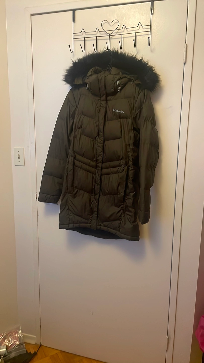 I'm selling a Columbia winter parka in olive green! It's perfect for staying warm during those cold Canadian winters. The jacket features a faux fur trim around the hood and has a flattering, feminine cut. It's in great condition and ready for a new home