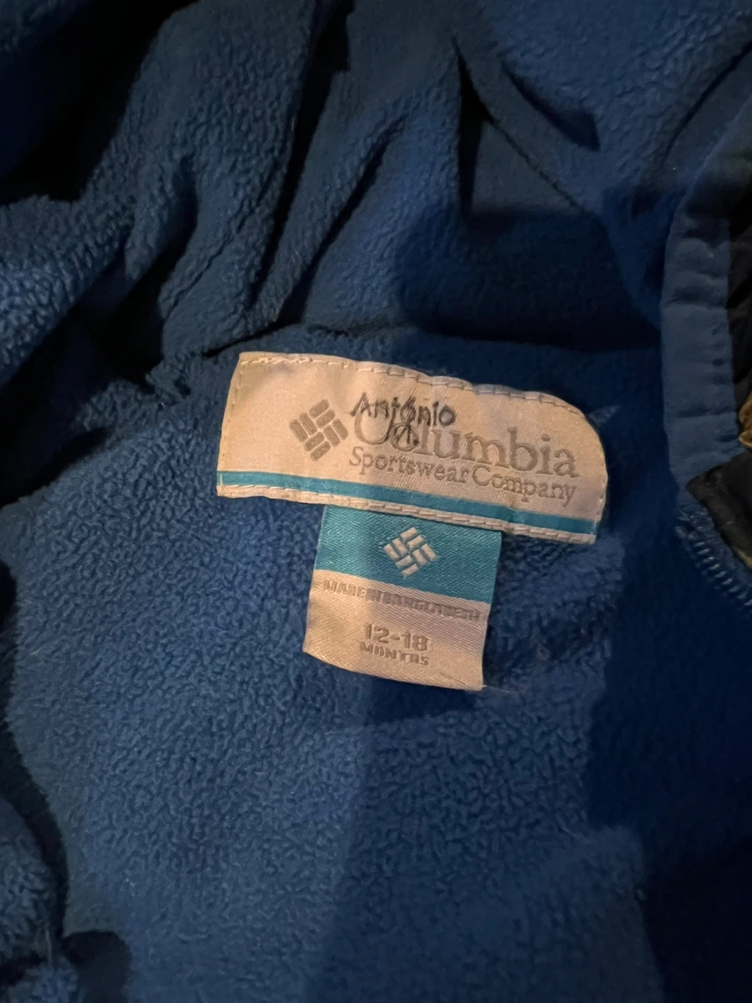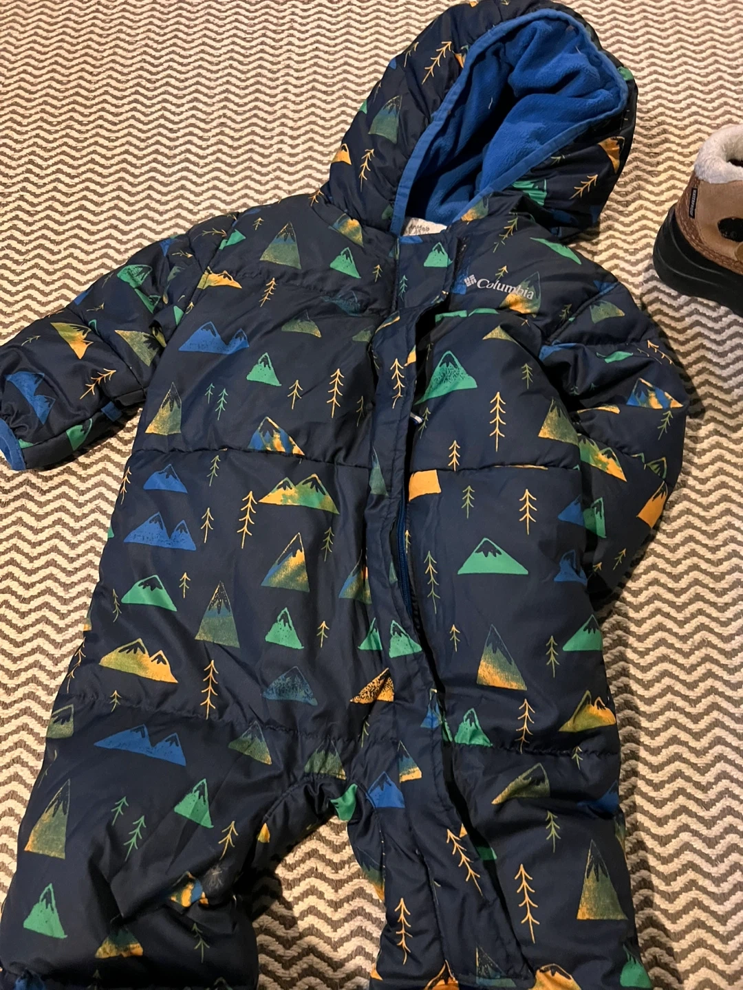 Keep your little one warm with this Columbia snowsuit! It's a size 12-18 months and features a fun mountain and tree pattern on a navy blue background. Perfect for winter adventures!