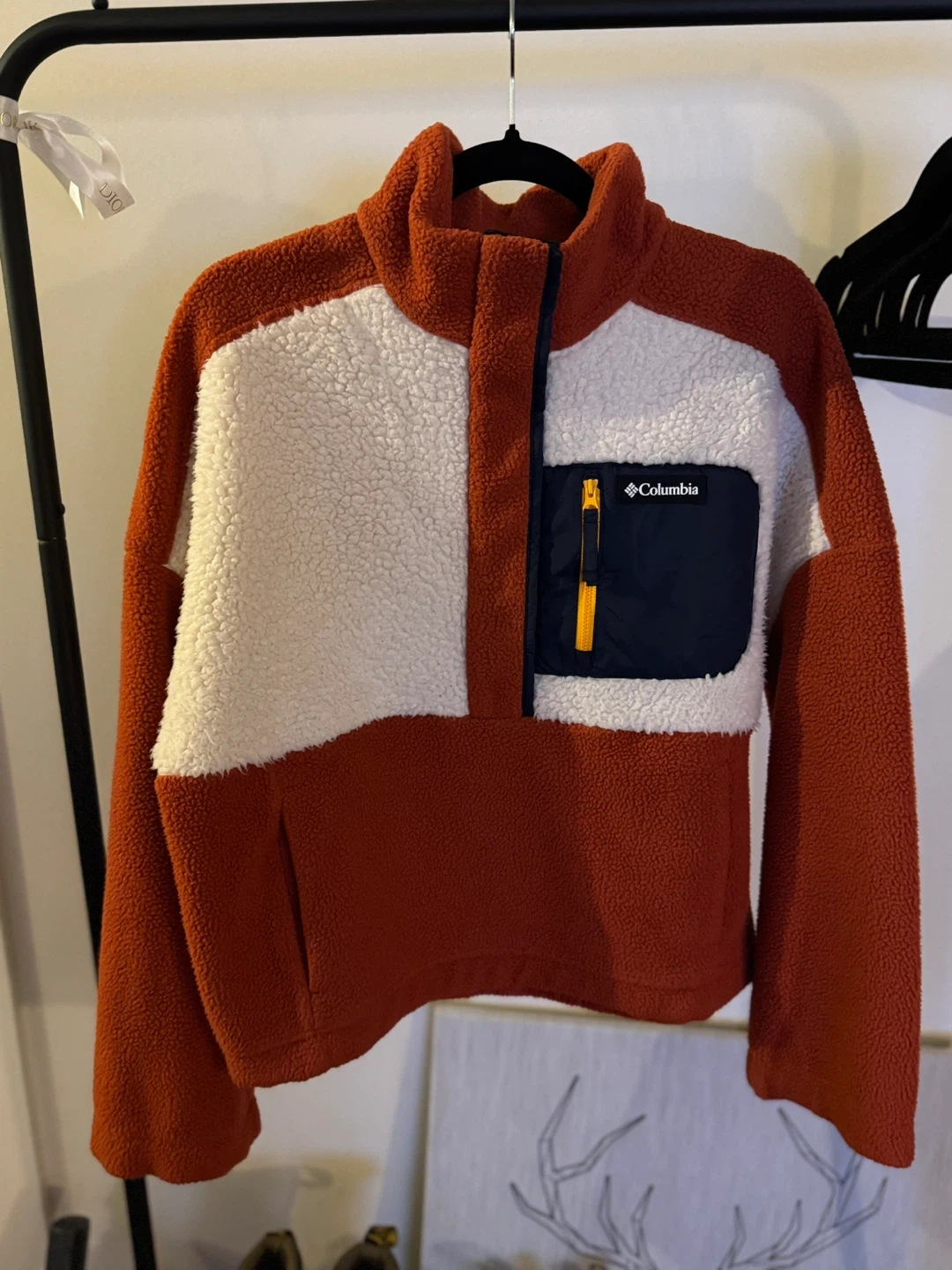 Cozy up in this Columbia fleece pullover! It's a women's size medium features a stylish colour-blocked design in white and rust. Perfect for layering on chilly days! Great condition. No flaws/ stains $15 Firm. Need gone Pick up @ Richmond Centre. First come first serve DM for more details