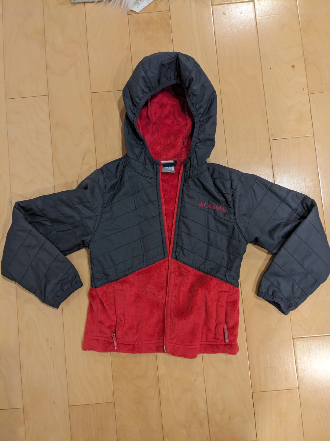 Cozy Columbia hooded jacket in size XXS (4/5). It features a grey quilted upper and red fleece lower, perfect for keeping your little one warm!