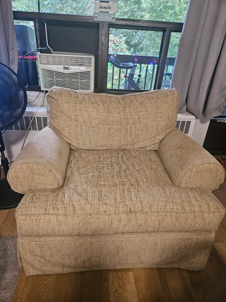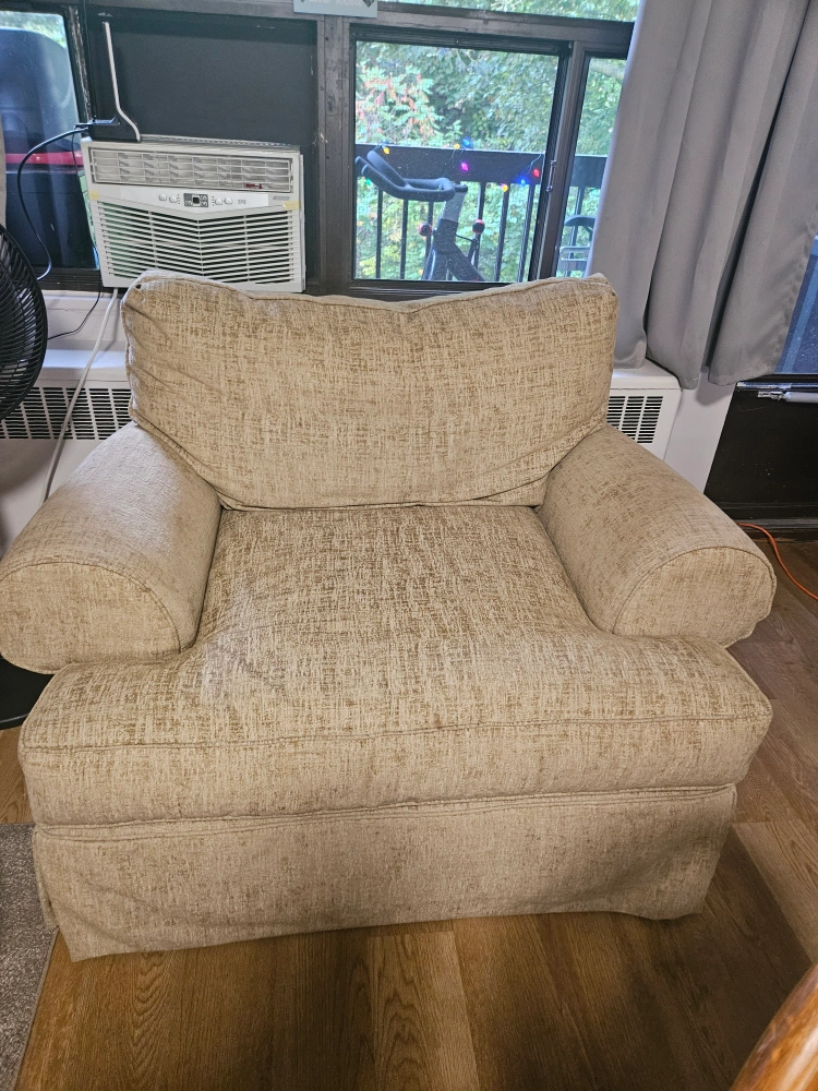 Selling a comfy beige armchair. It's perfect for relaxing after a long day! The material is soft and inviting, and it's in great shape. It would be a great addition to any living room or den