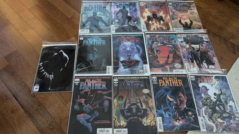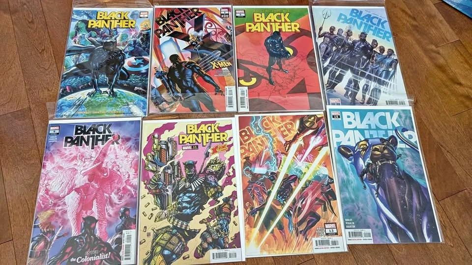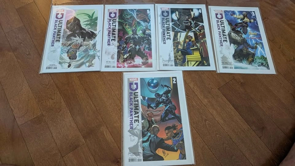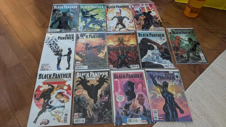 Selling the following: Comes from a pet free and smoke free home all issues have been in sleeves, and are in great conditions, and have been stored in the comic boxes Or take all with box for 160 Black Panther (2005)1 to 6 Reginald Hudlin $30 Black Panther [hidden information] to 18 + 166 to 172 Ta-Nehisi Coats Complete, 1st issue is signed by artist Brian Stekefreeze $100 Black Panther [hidden information] to 25 Ta-Nehisi Coats complete Includes annual $50 Rise of the Black Panther (2018) 1 to 6 Ta-Nehisi Coats Complete $30 Black Panther [hidden information] to 15 Complete $40 Black Panther [hidden information] to 12 complete $30 Ultimate Black Panther (2024) 1 to 6 $20 Vengeance of MoonKnight 1-6 $20