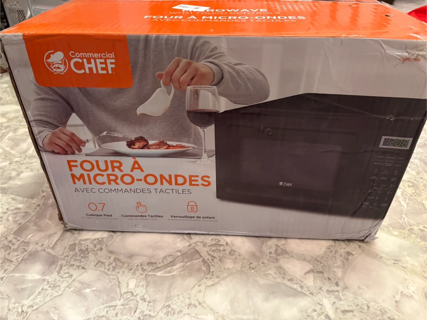 Selling a brand new Commercial Chef microwave, still in its original box, unopened. Accidentally got two, as a gift. Perfect for small spaces or anyone needing a reliable microwave. Commercial Chef CHM770B 700 Watt Counter Top Microwave Oven, 0.7 Cubic Feet, Black Cabinet