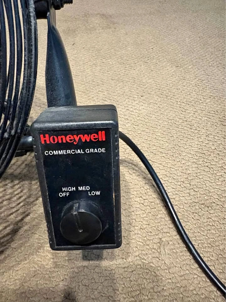 Honeywell commercial grade adjustable 24" 215W High-Velocity, Heavy-Duty Industrial Fan, Drum Fan, with UL-Certified Safety Compliance, 2 Speeds, Up to 8820 CFM, 5.9-ft Power Cord, 2 Wheels, Metal Housing/Blades, Black (new $150)