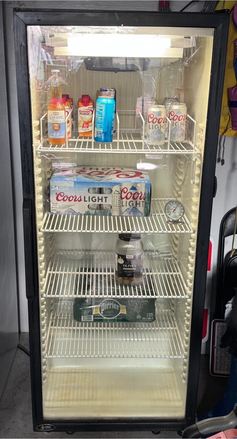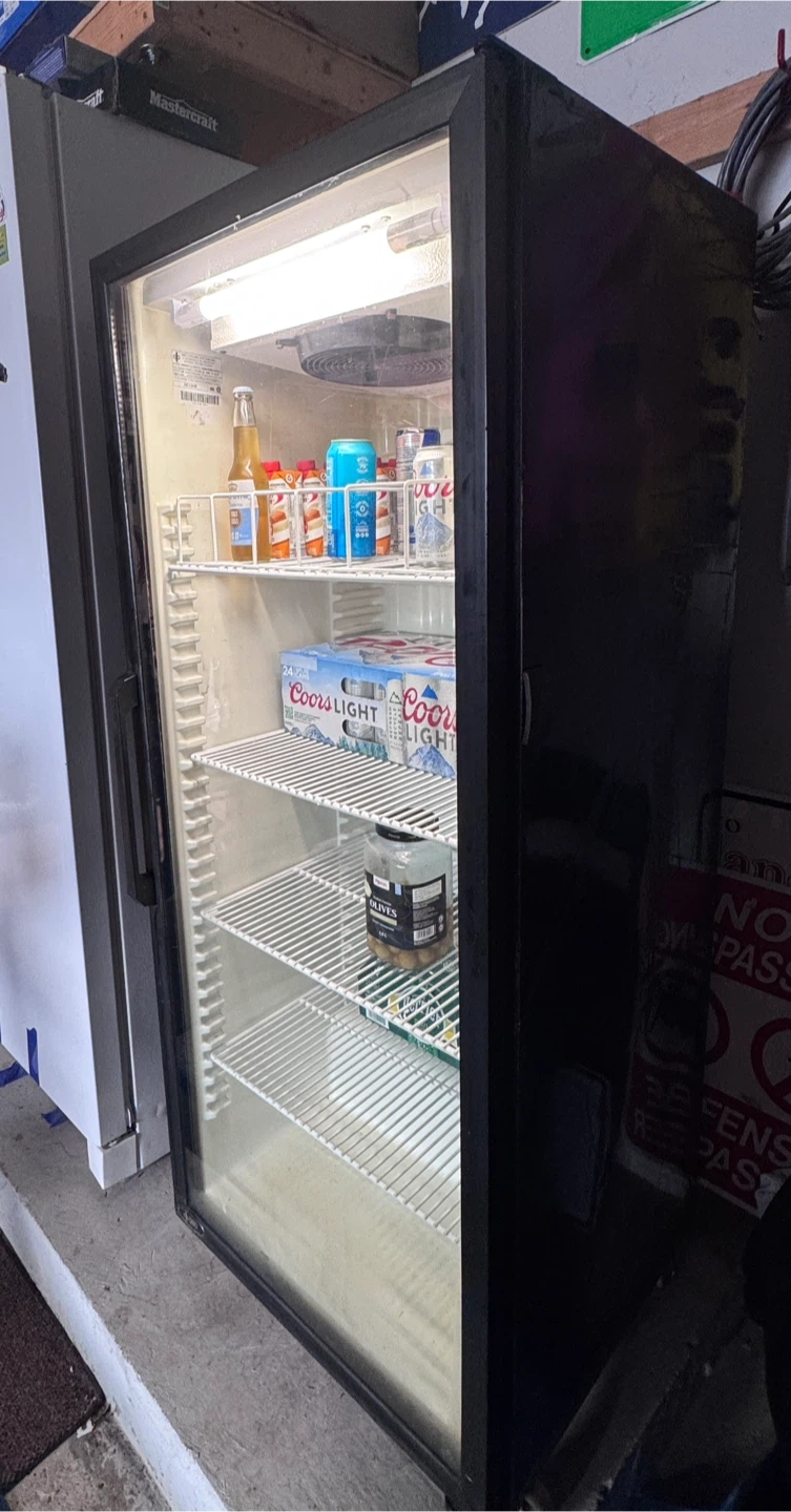 Selling a commercial refrigerator. It has a black exterior and a glass door. It has multiple shelves. There is a thermometer inside.