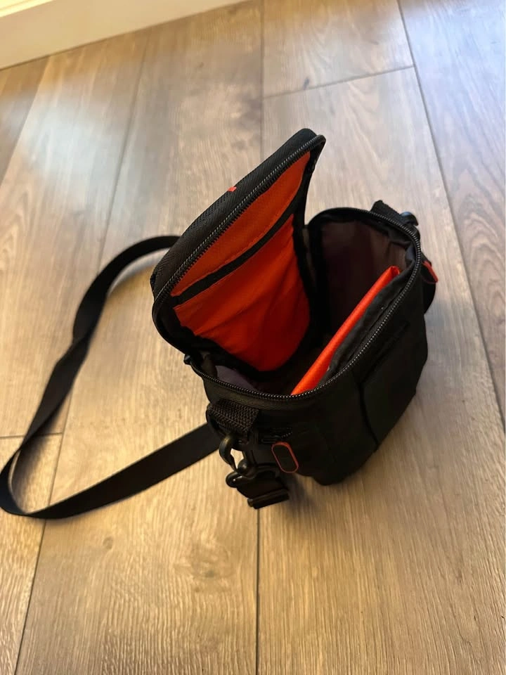 Easy to remove camera from bag. Internal flex wall for cable storage. Integrated belt loop, padded handle and removable shoulder strap offer multiple carrying options. Separate side pockets for battery, cable or lens cap storage. Internal, zippered pocket for SD card storage. Shoulder strap included. Fits devices : 13 x 8.5 x 14.7 cm. Let me know if you have any other query. Only cash please.