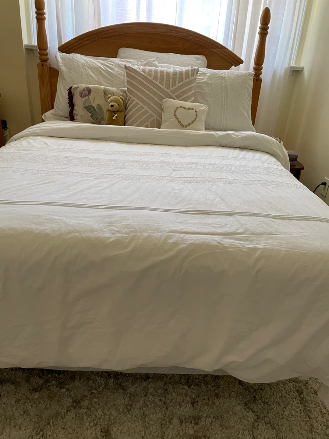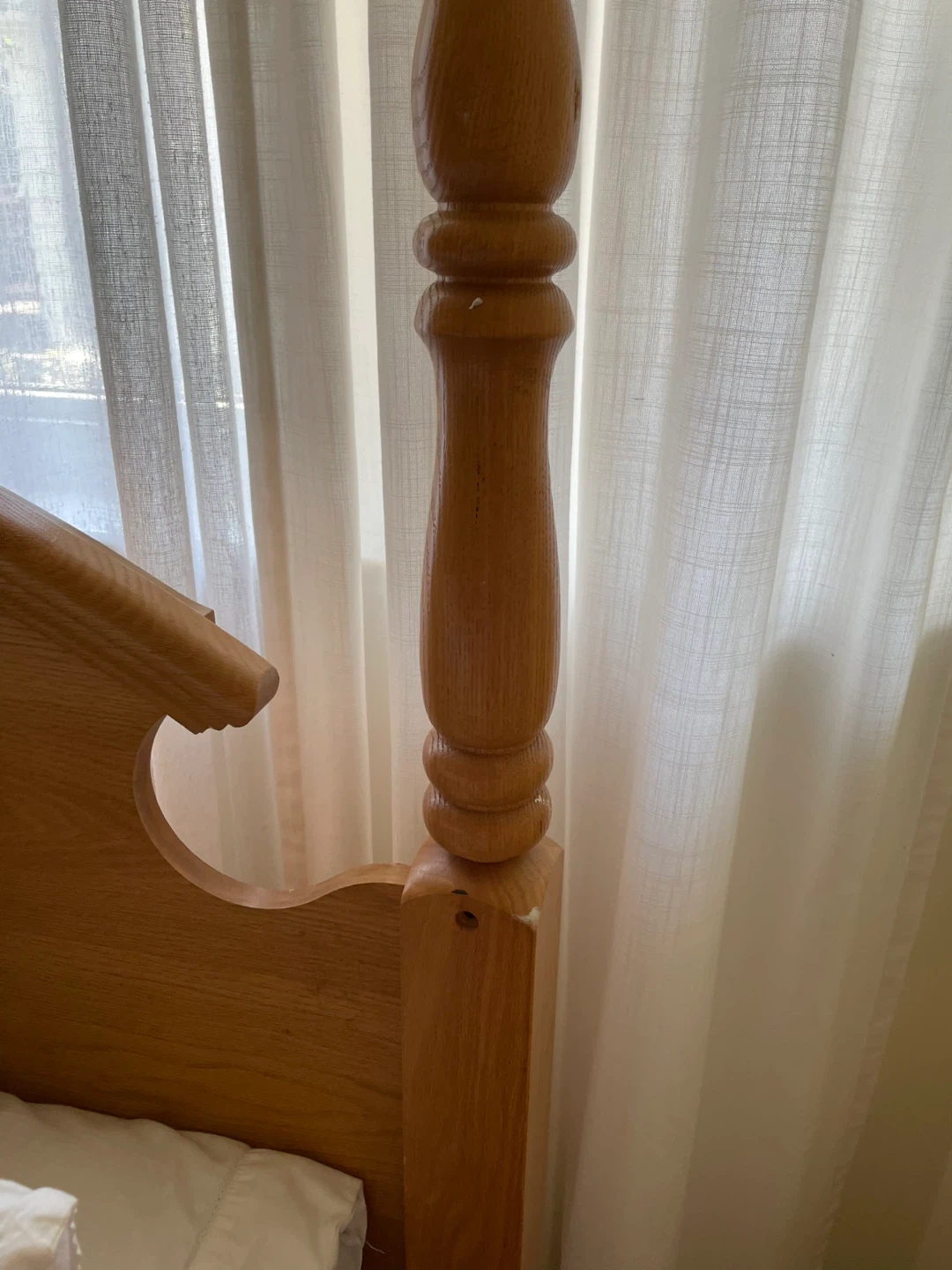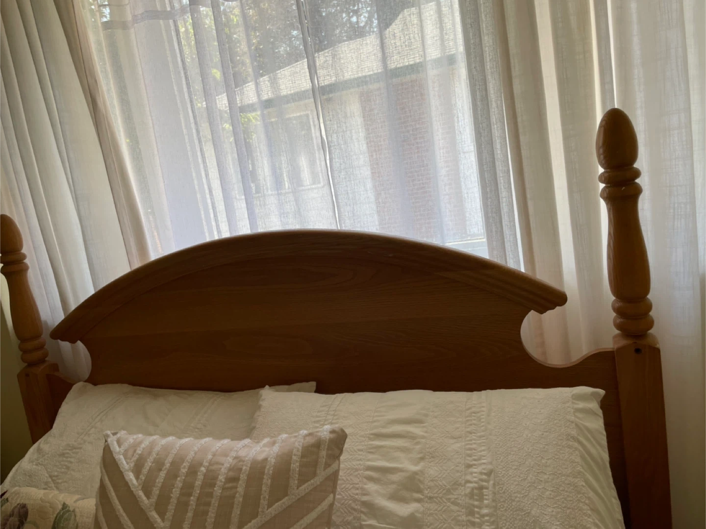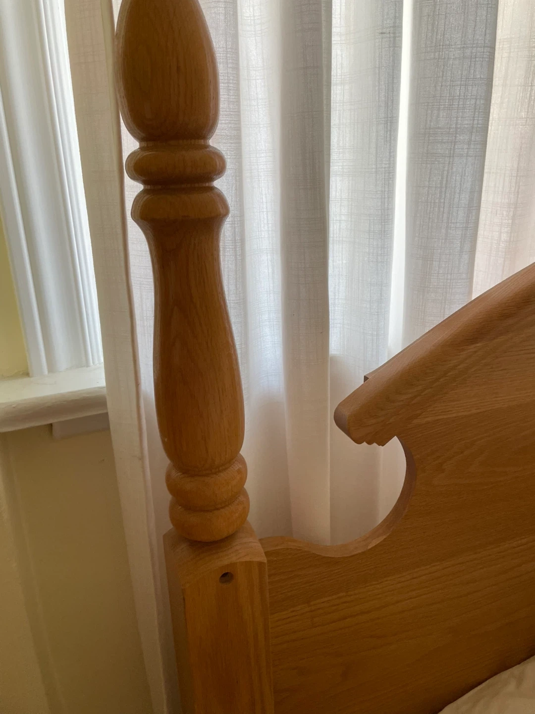 BED WITH PILLOW TOP MATTRESS, BOX, BASE METAL FRAME AND HEADBOARD. Light pine wood. All great condition. Complete in perfect condition. THE PRICE INCLUDES: - SOLID WOOD PINE HEADBOARD WITH FINIALS BUILT IN - FULL SIZE PILLOW TOP MATTRESS - FULL SIZE BIX SPRING - METAL BED FRAME BASE. Great deal for all of these pieces . Bed size: 77” x 56” The headboard is 64” long Pick Up In Scarborough midland and Eglinton Note: bed linens and cushions not included