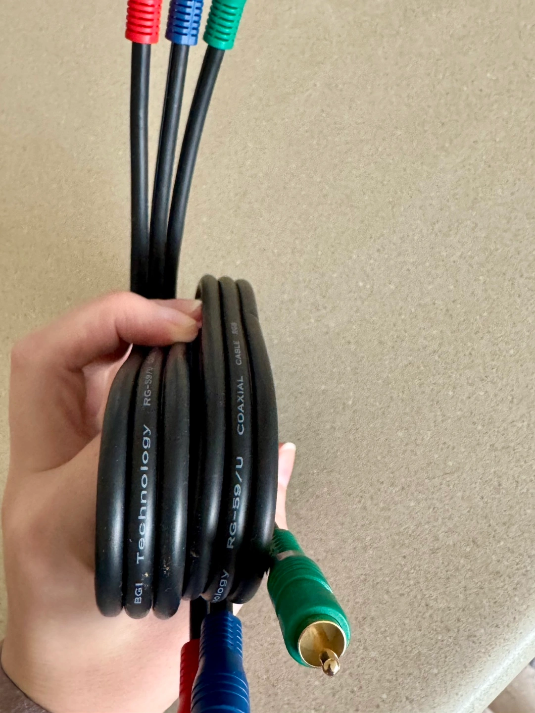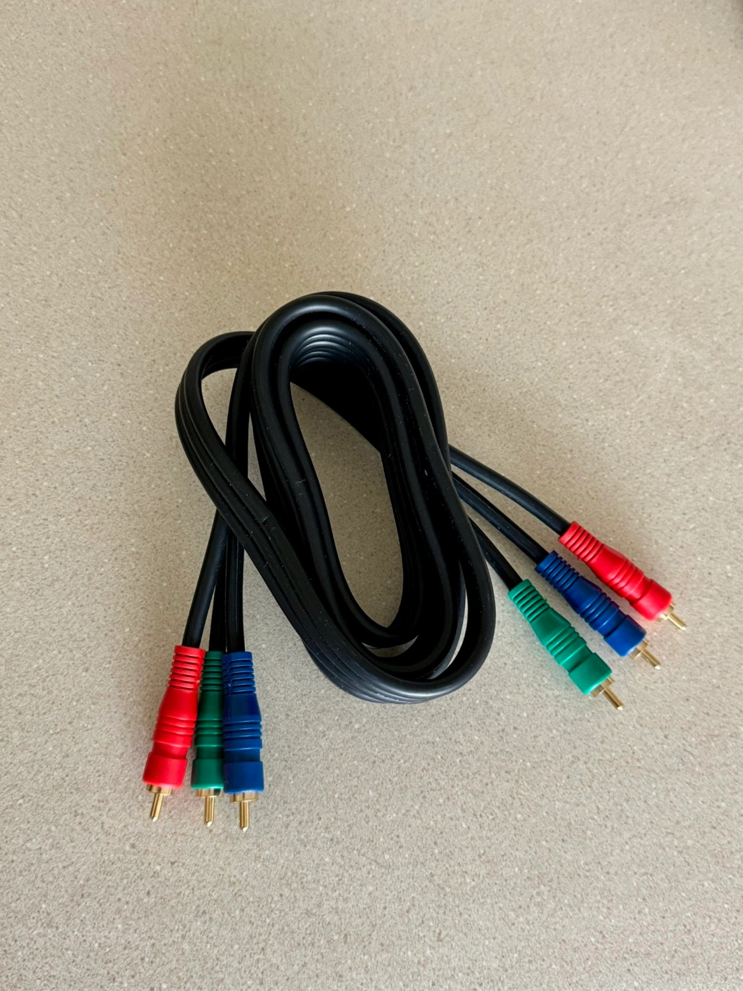 Black component video cable. Three RCA connectors. RG-59/U coaxial cable. New.