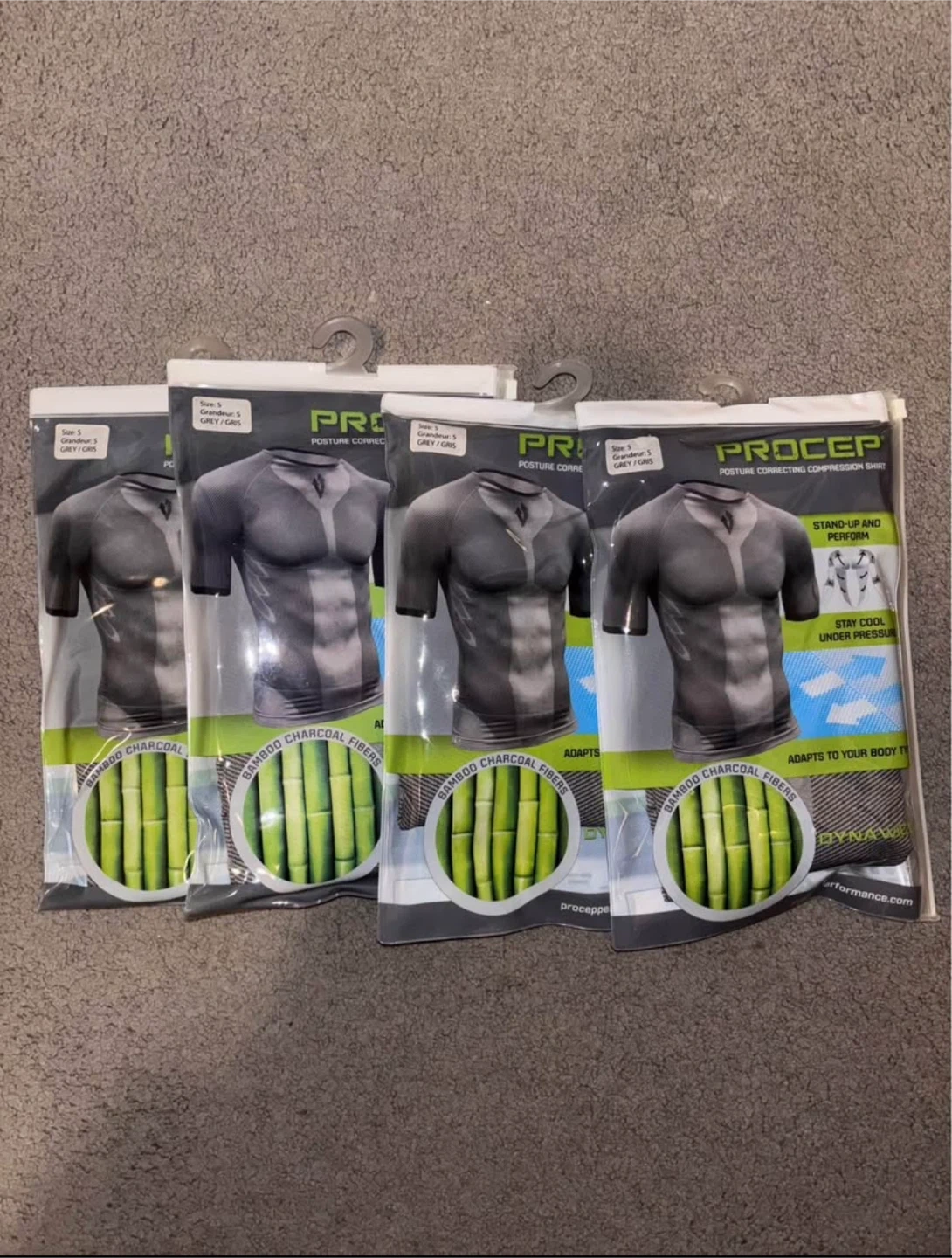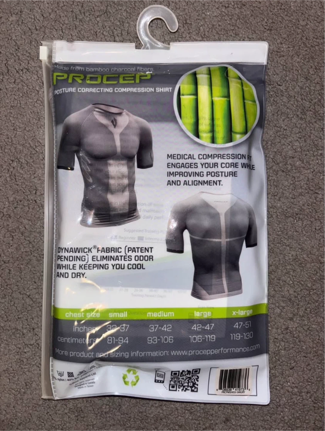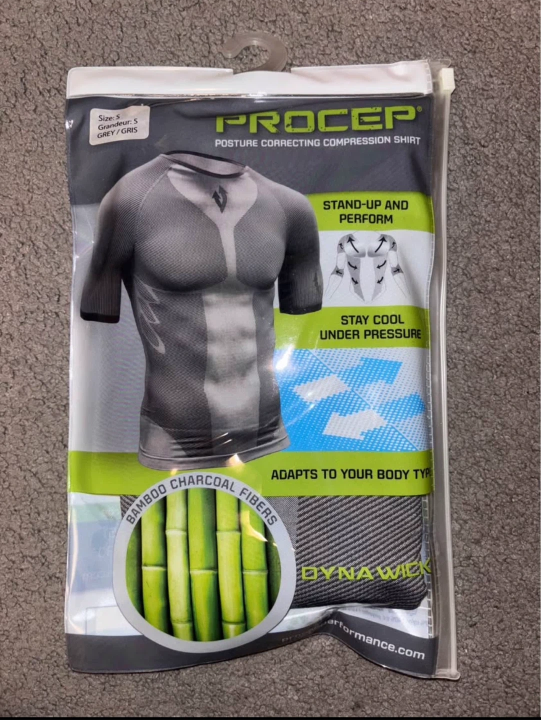 I have a brand new Procep posture correcting compression shirt in size small. It's grey and made with bamboo charcoal fibers. It's designed to adapt to your body type, help you stand up and perform, and stay cool under pressure. The Dyna-Wick fabric eliminates odour and keeps you cool and dry!