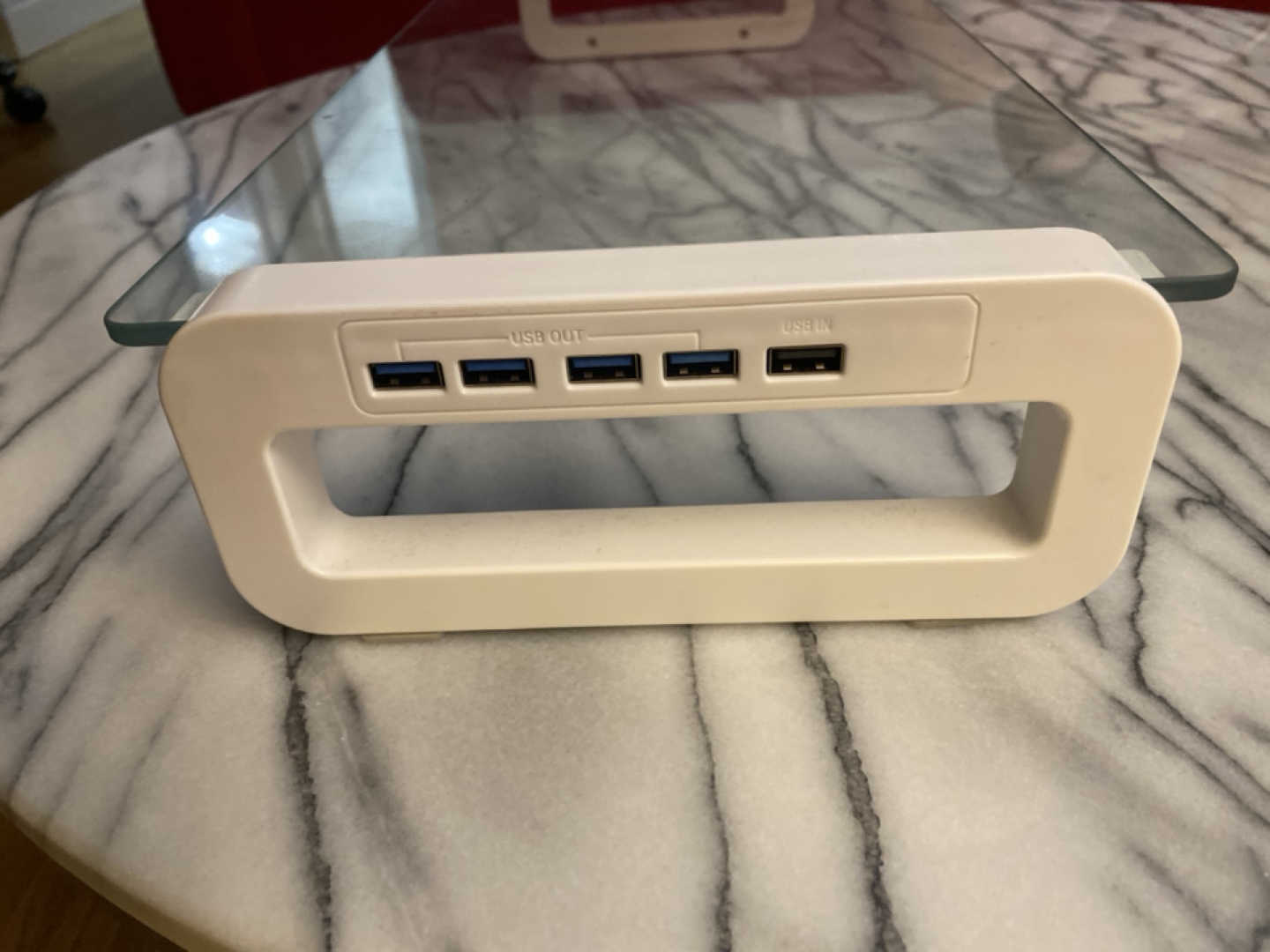 Computer monitor stand with USB connections built in.