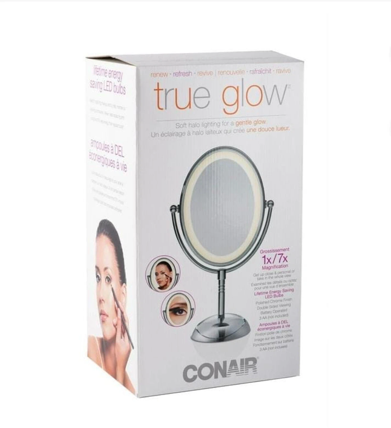 Selling a Conair True Glow lighted makeup mirror, still in its original box! It features soft halo lighting for a gentle glow. This mirror also has double-sided viewing with 1x/7x magnification. Get a close-up look for personal care or makeup application. It uses lifetime energy-saving LED bulbs