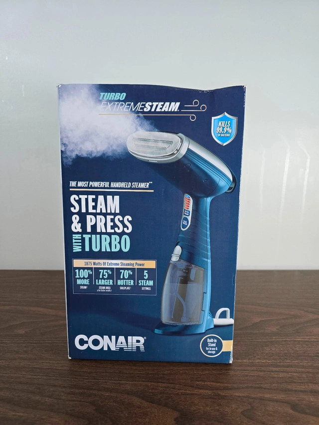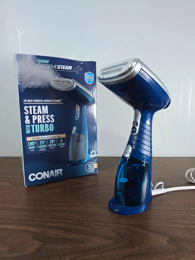 Get wrinkle-free clothes instantly with this powerful Conair handheld steamer – used just a few times and works perfectly! ✔ 1875W Turbo Steam – Removes wrinkles in seconds ✔ 40-Second Heat Up – Ready to use fast ✔ 5 Steam Settings ✔ 15 Continuous Minutes: 7.3-ounce water tank allows for up to 15 minutes of continuous steam Like new condition – no issues! Pickup in Stratford Smoke-free/Pet-free home More listings available on my profile—check them out!
