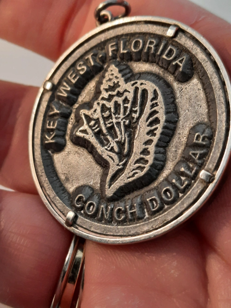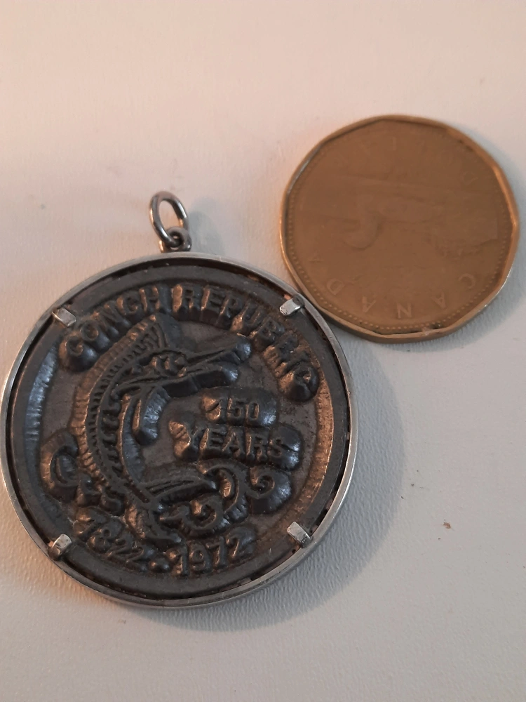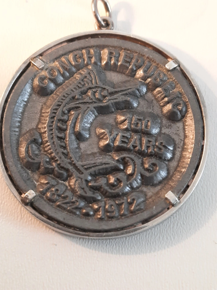 Selling a unique pendant featuring the Conch Republic design. wrapped in sterling silver. It commemorates 150 years (1822-1972) and includes a depiction of a conch. A cool piece for collectors or anyone who loves unique jewellery!