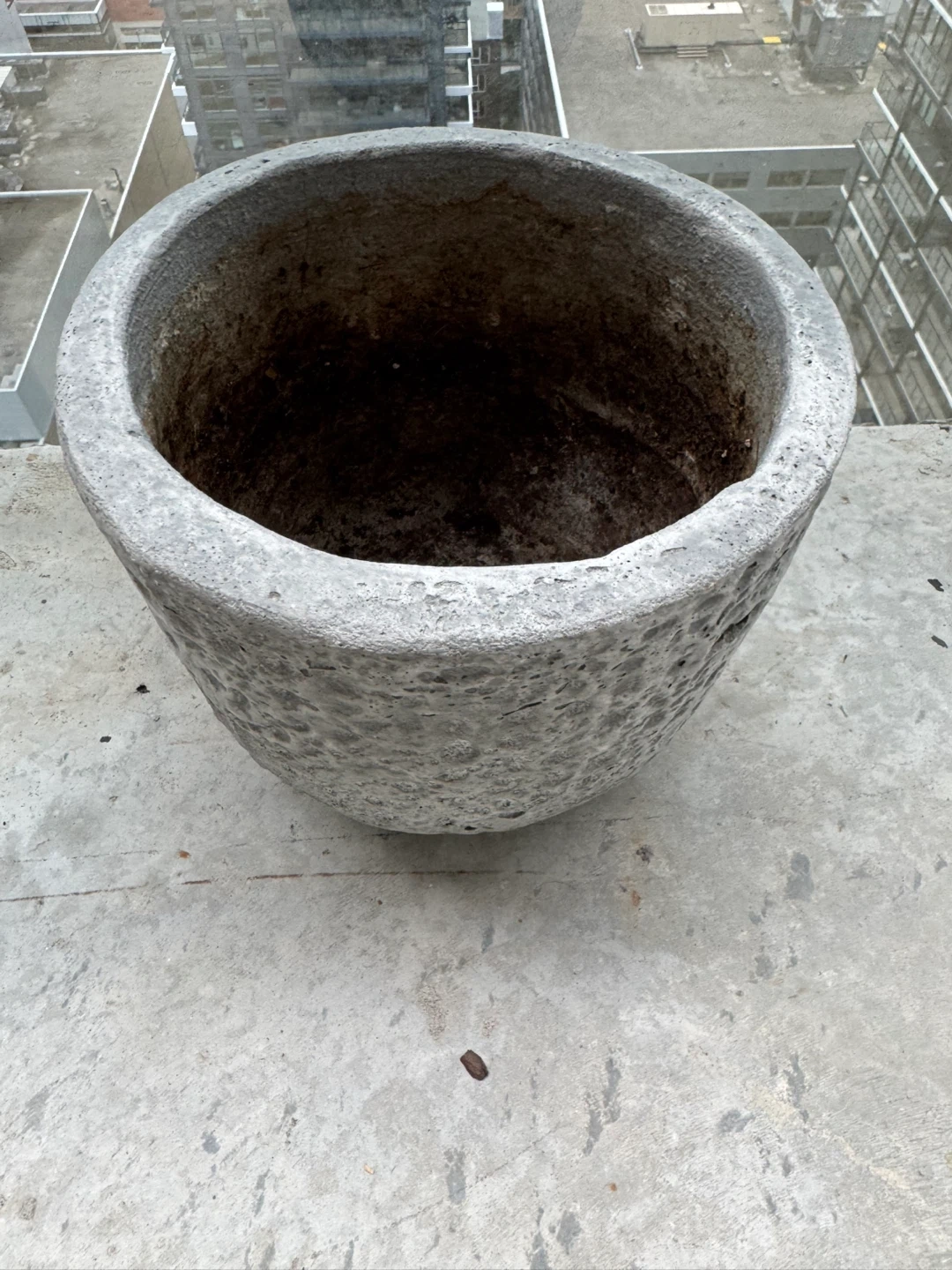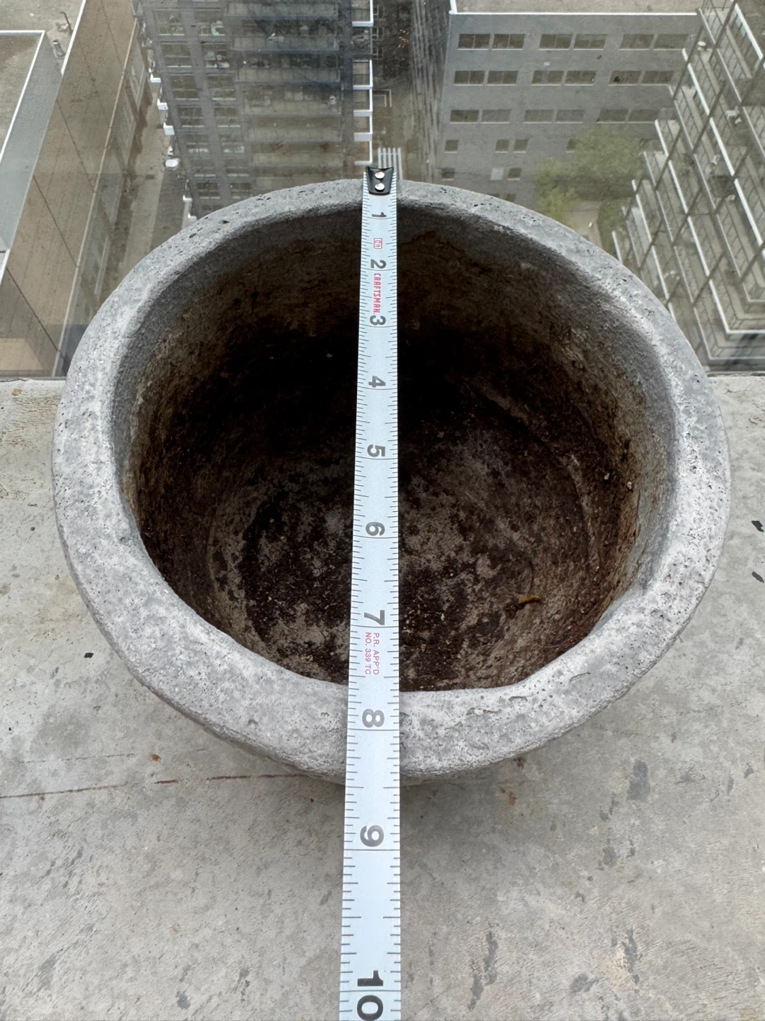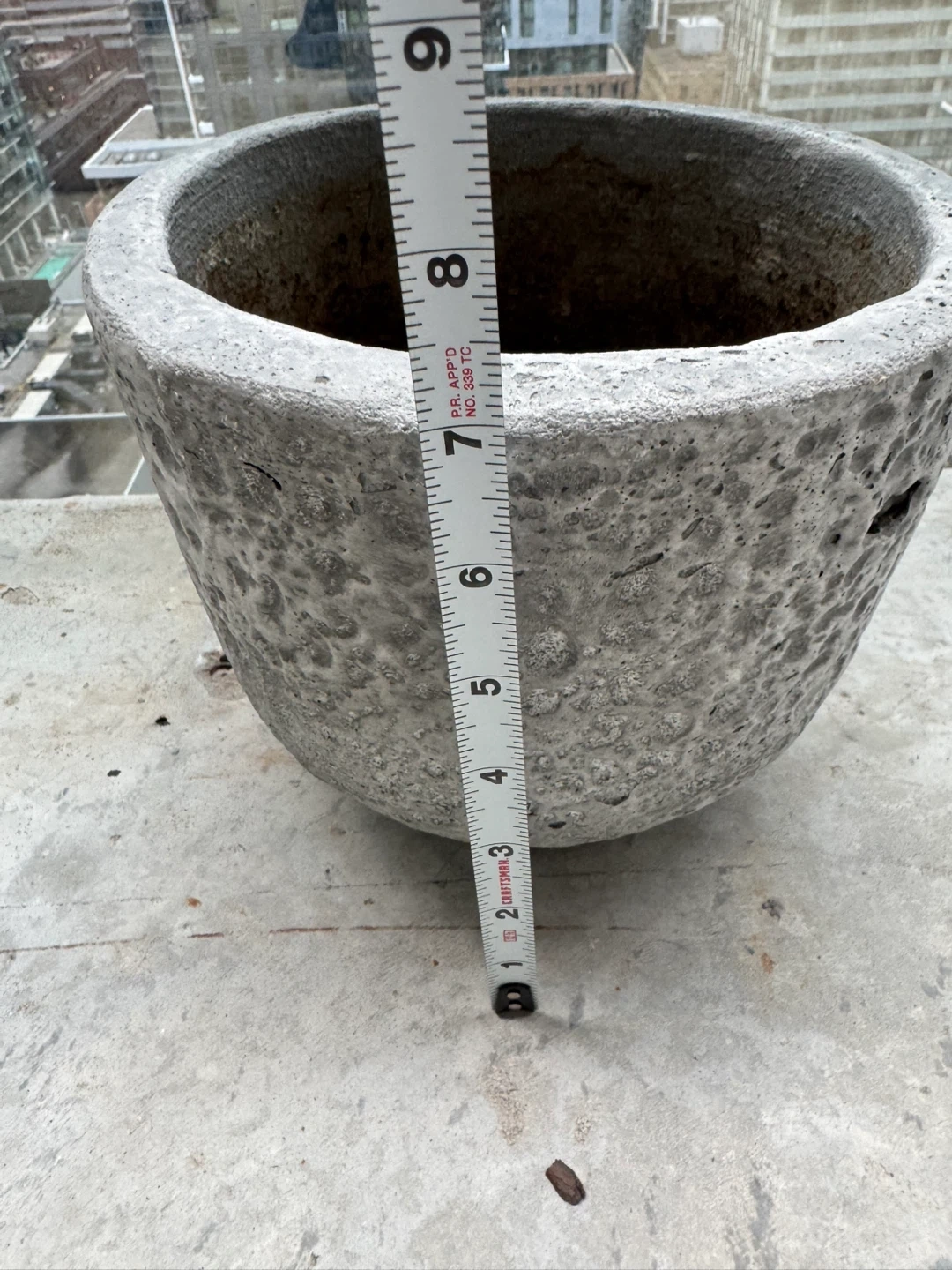 I'm selling a concrete planter. It has a diameter of approximately 9 inches. It's perfect for adding a touch of nature to your space!