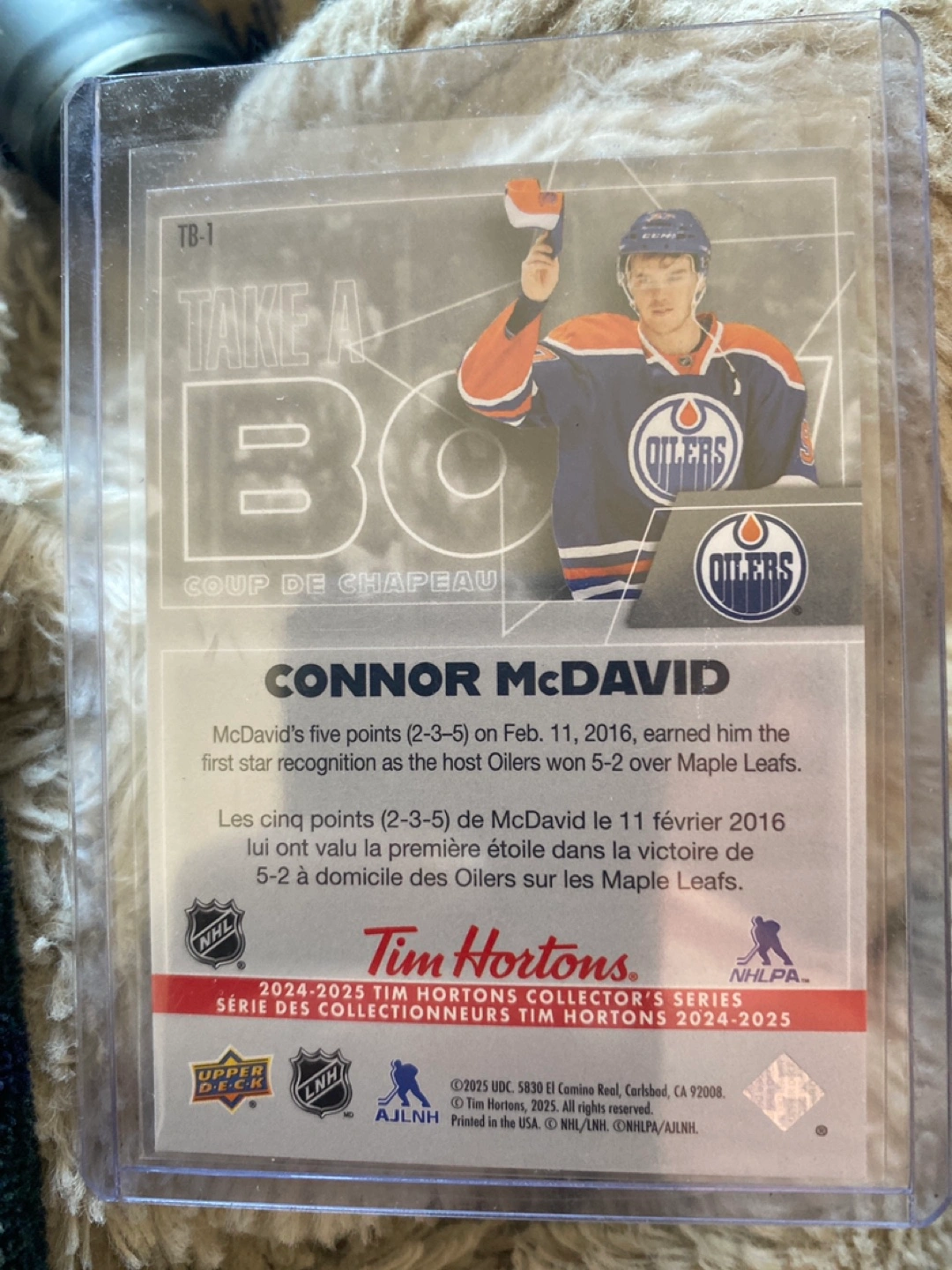 Selling a Connor McDavid hockey card from the 2024-2025 Tim Hortons Collector's Series! This card commemorates McDavid's achievements with the Oilers. A great addition for any hockey fan or card collector
