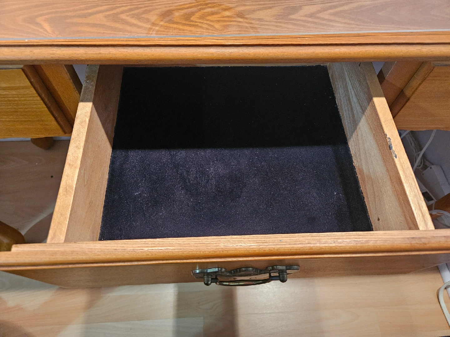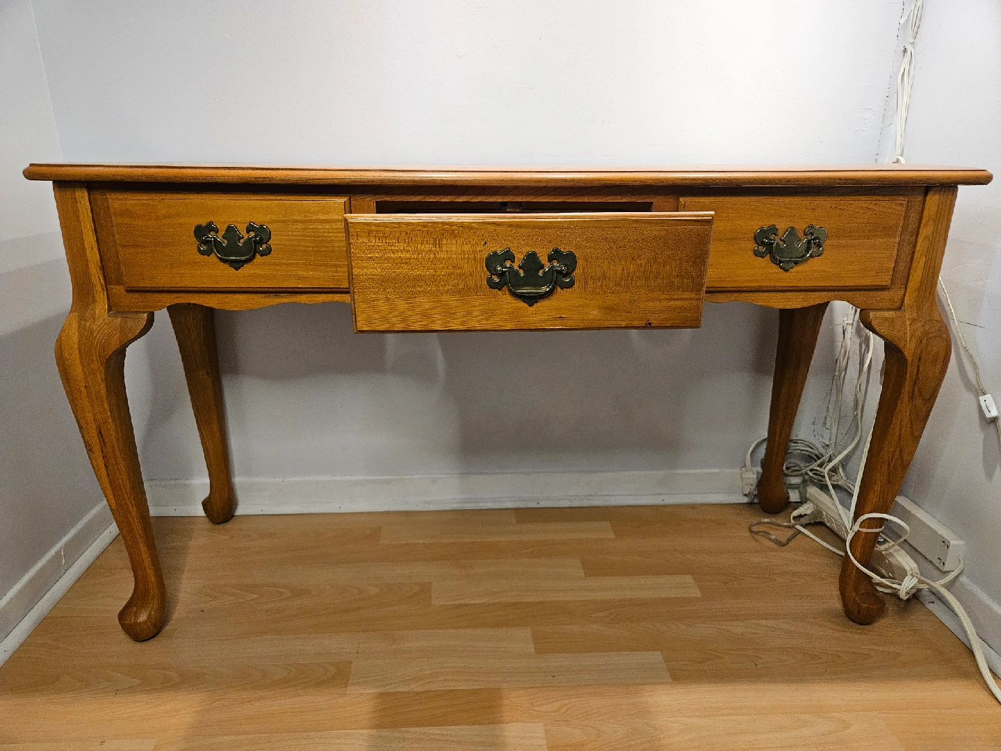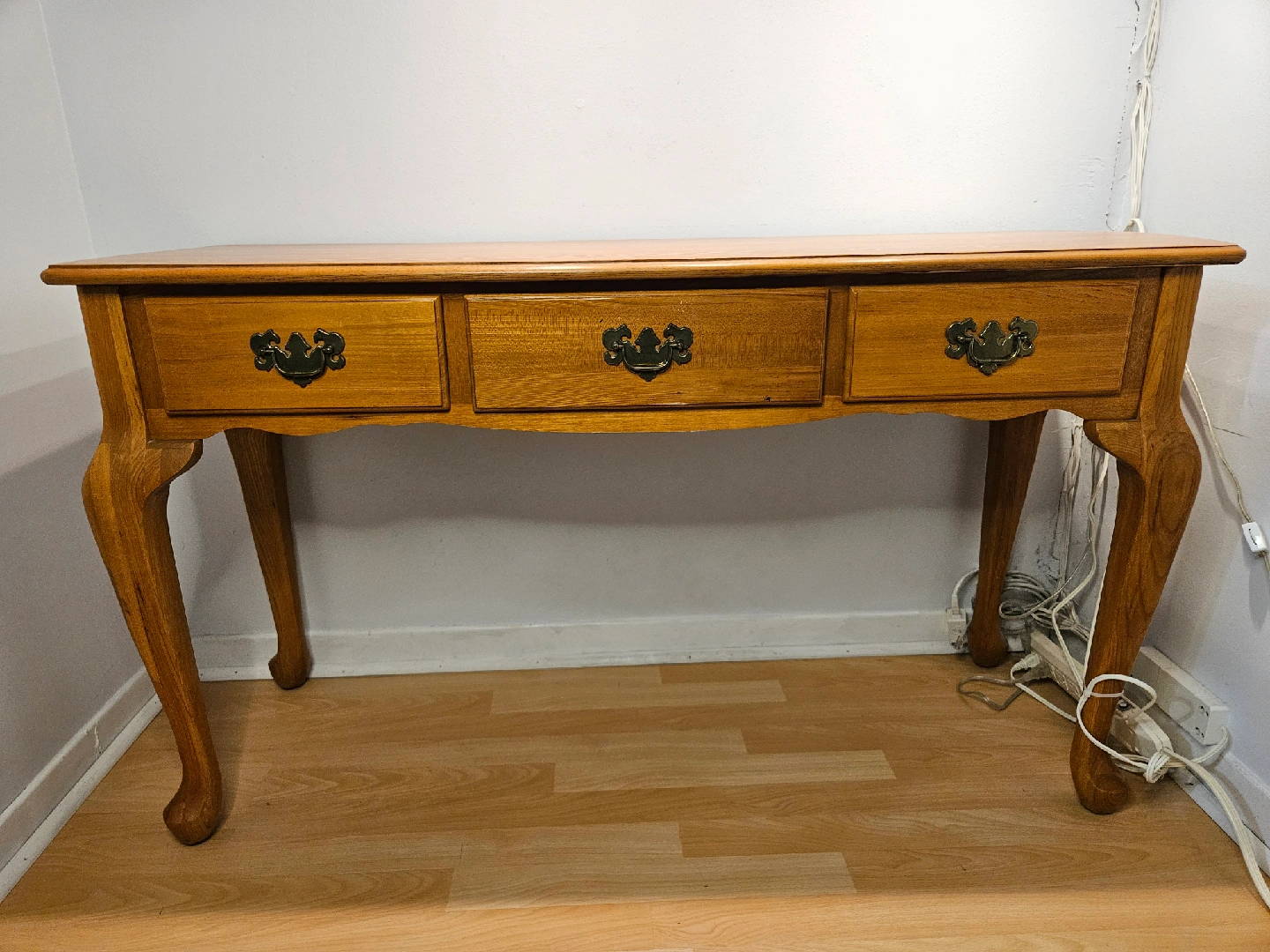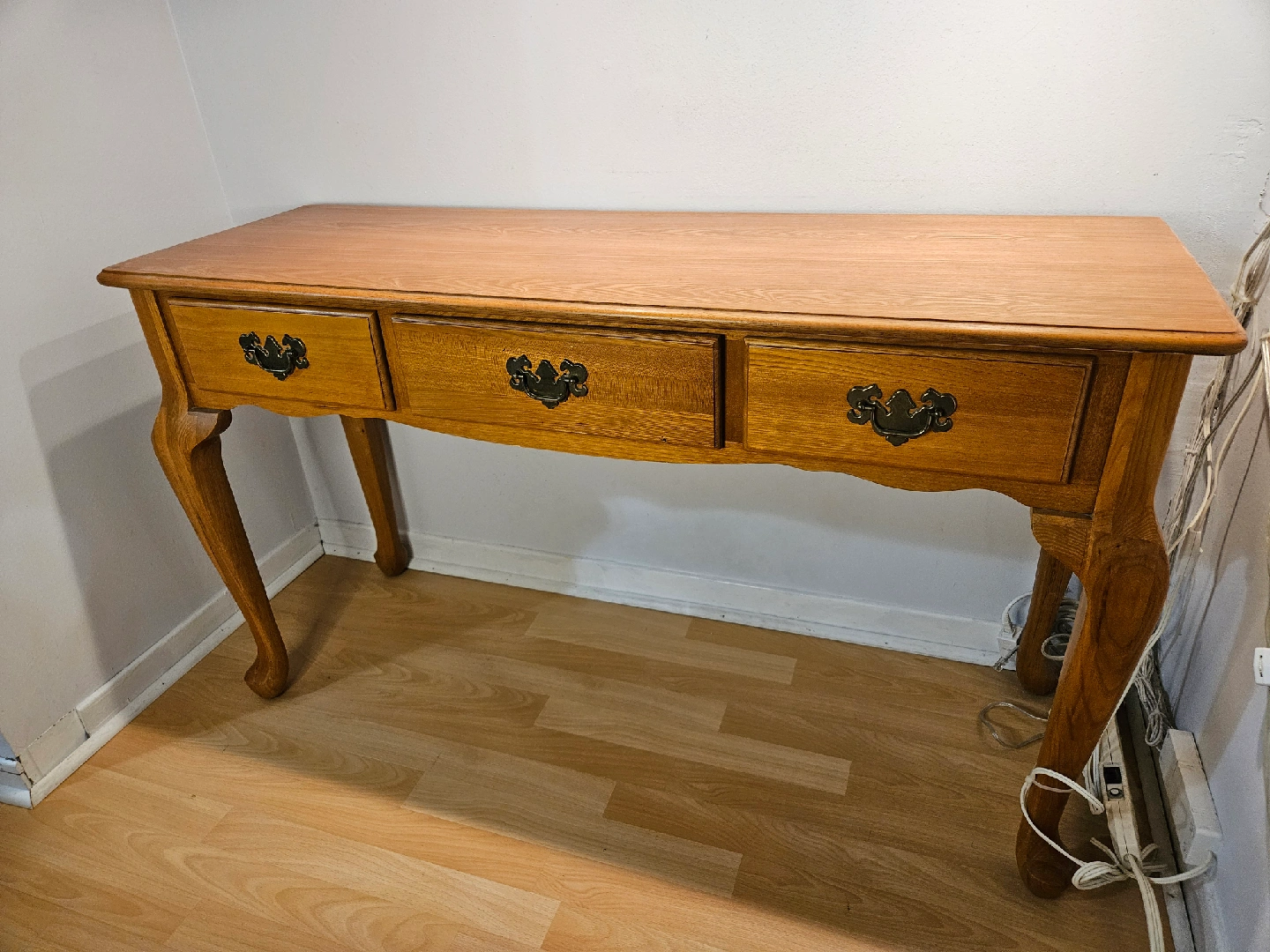 •Used - Like New •Queen Anne Style Console Table •Only 1 drawer is meant to open (the middle one) with 2 faux drawer fronts on either side •Dimensions: 28" H x 48" W x 16 1/4" D •Pick up Brampton - Kennedy & Vodden