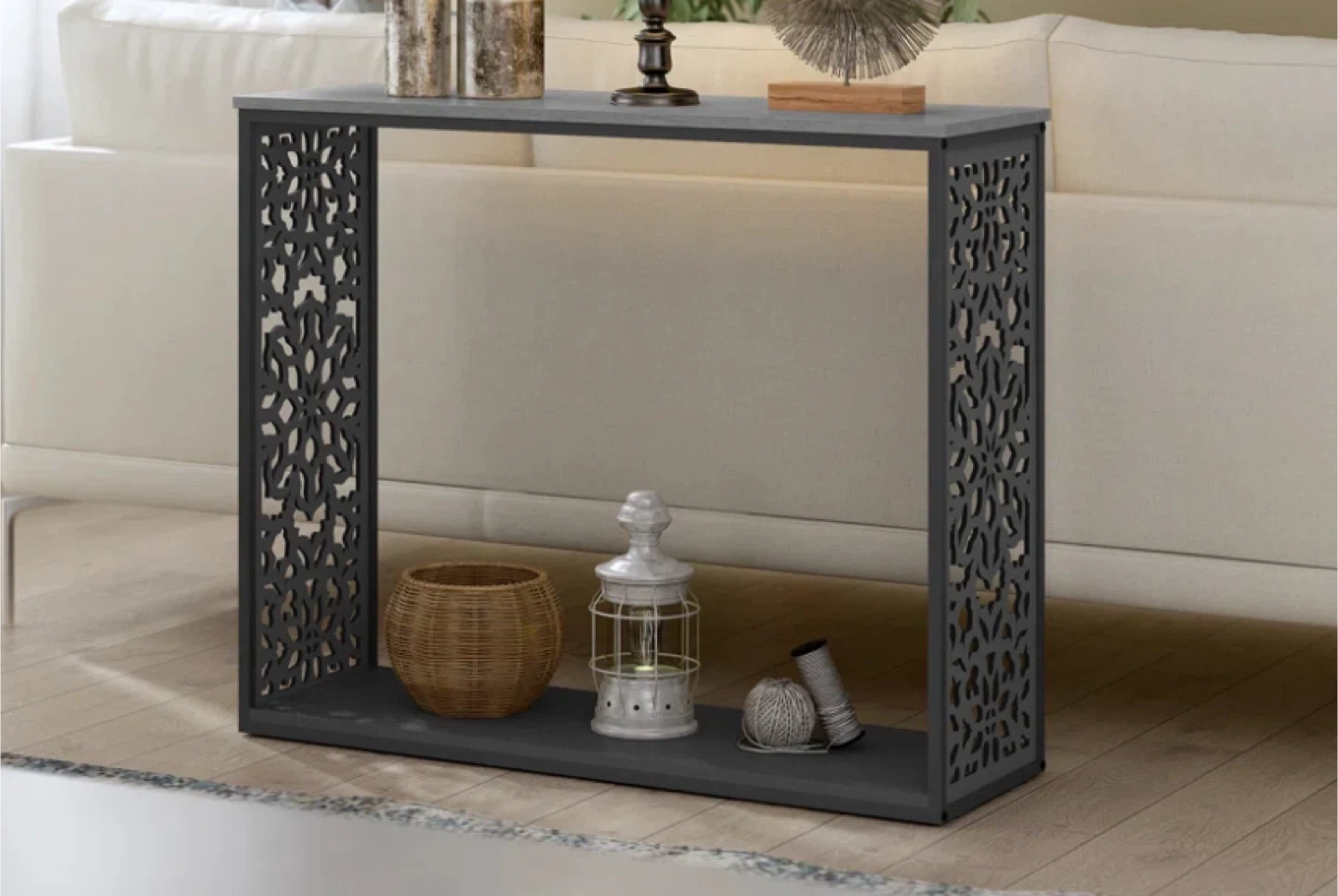 Selling a stylish console table, perfect for adding a touch of elegance to your entryway or living room! It features decorative cutouts on the sides and a sleek grey finish. Would look great with some plants or decorative items on top!