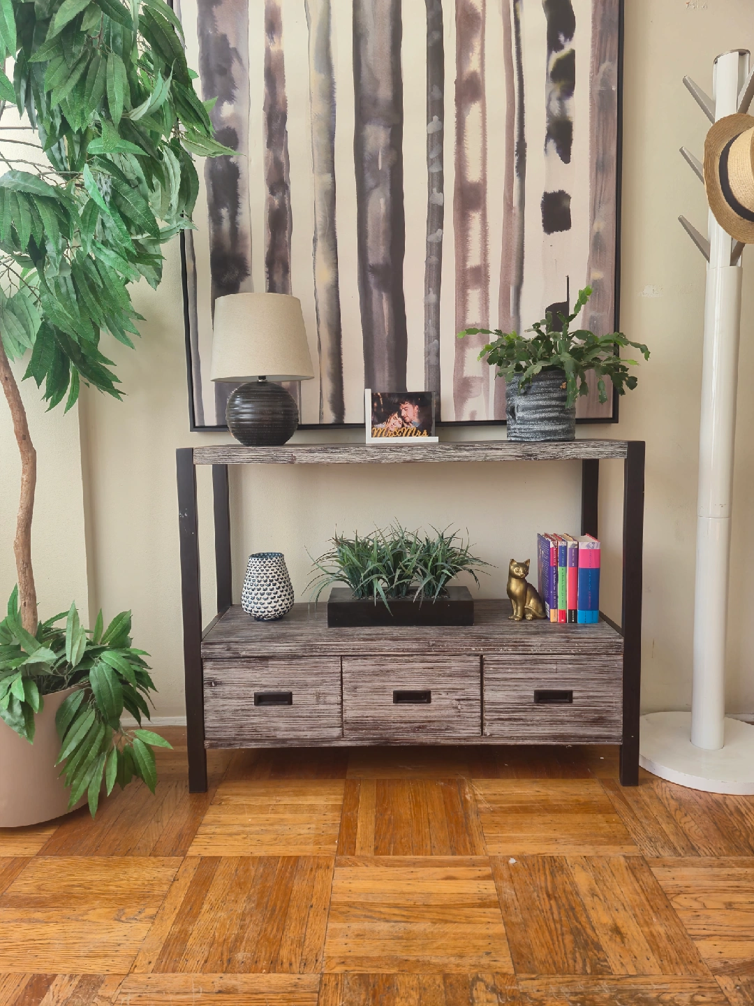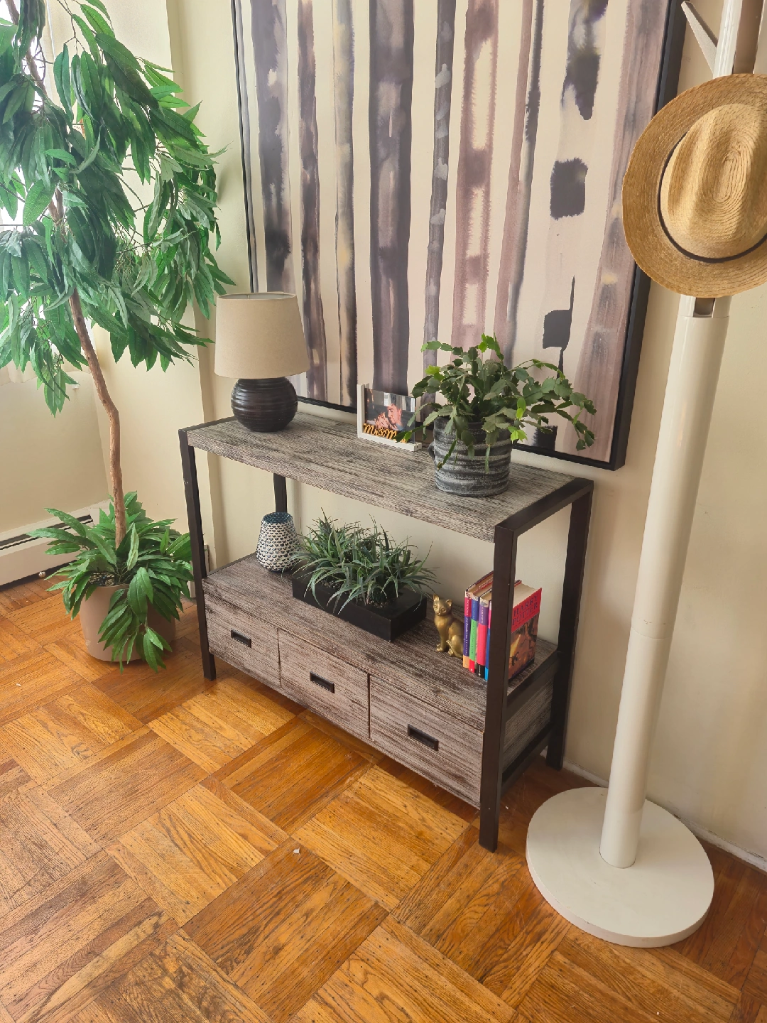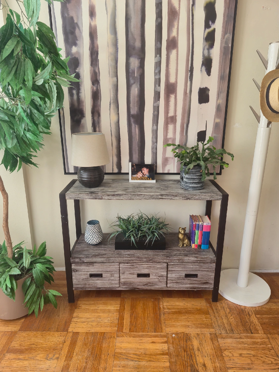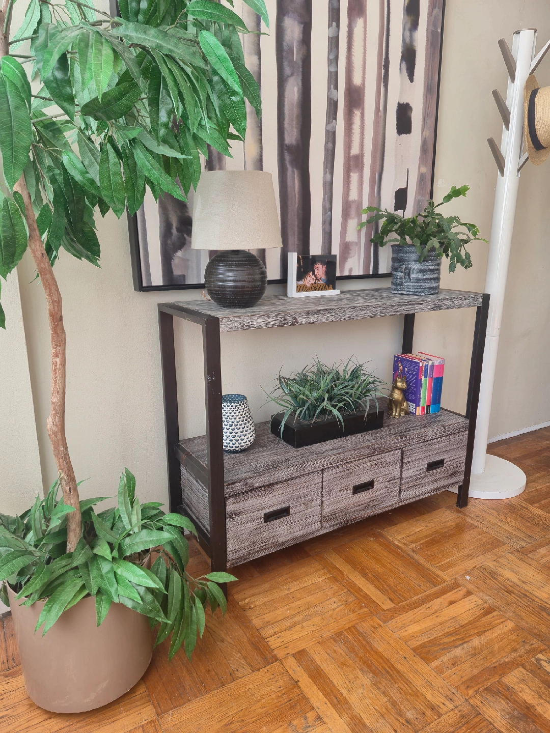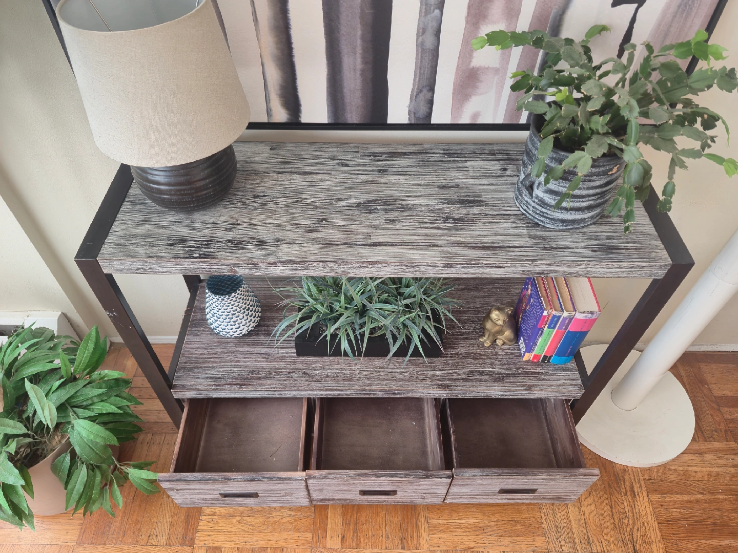 Selling a console table with a rustic style finish and three drawers. It's in decent shape and perfect for an entryway or living room. 42w x 14d x 32h Pick up in downtown Vancouver or delivery may be arranged for a reasonable fee. Priority is given to whom is able to pick up. Follow us on Instagram: https://www.instagram.com/vanvaluevintage Tags: console Table hallway table sofa table solid wood mahogany walnut maple brass gold copper plant stand tv bench credenza sideboard Hutch server buffet living room dining room retro vintage antique rental set dec mcm cb2 eq3 west elm vintage retro antique console table delivery
