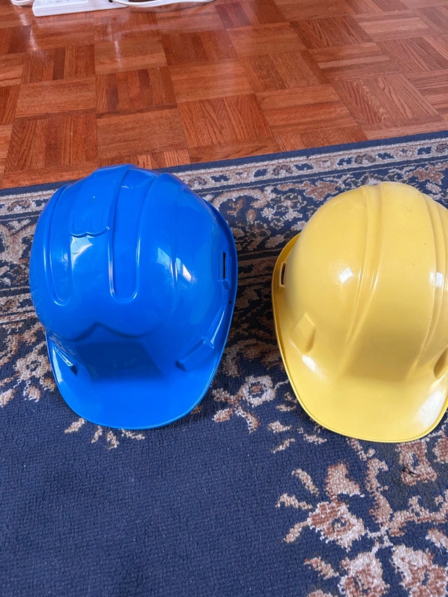 I am selling a yellow and blue construction helmet. They are used, but in good condition. Perfect for any construction project. These hard hats have seen some action, but they're ready for more! Grab them now and keep your head safe and stylish. If you're seeing this ad, these helmets are still available! 2 for $15