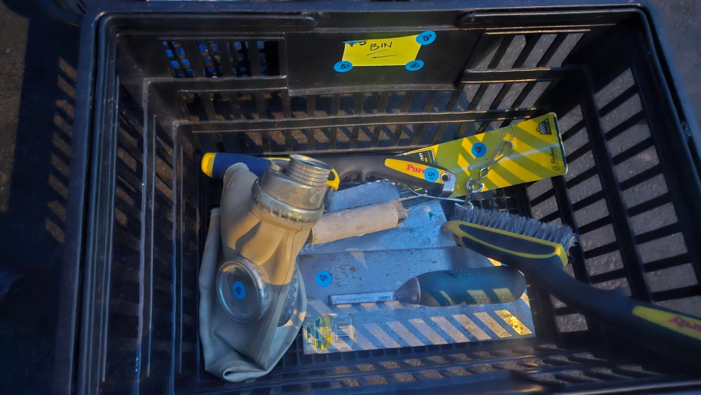 A collection of construction tools, including a mask, trowel, and brush. All items are used but in working condition. Great for DIY projects!
