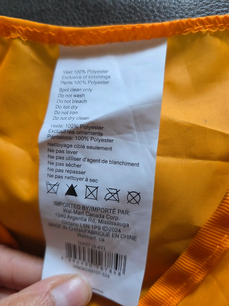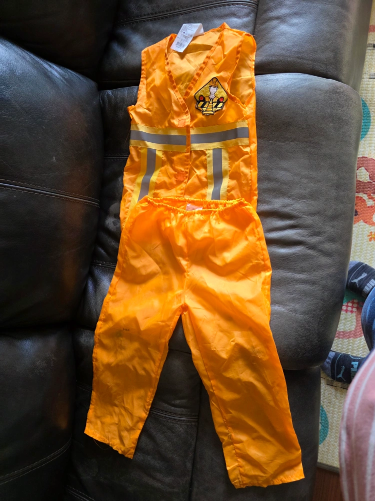 A fun construction worker costume for your little one! The set includes a vest and pants, both made of 100% polyester. It's in great condition and ready for imaginative play. Size is 3-4T