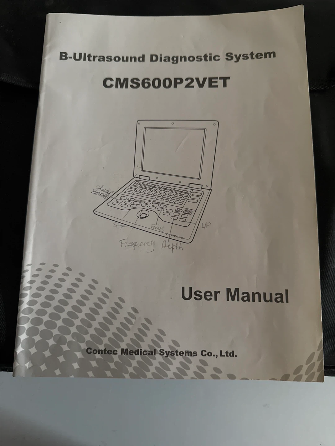 Selling a Contec Medical CMS600P2VET B-Ultrasound Diagnostic System. Includes the user manual and a book titled "Ultrasound for Canine Pregnancy Scanning".