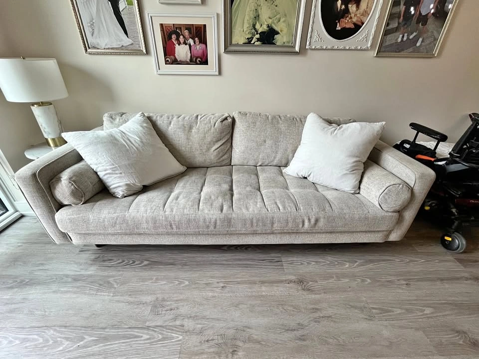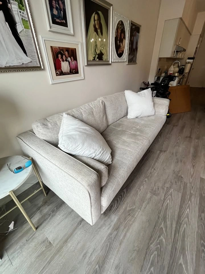 For sale is a stylish and comfortable contemporary sofa. This couch features a modern design with clean lines, track arms, and a light-colored, textured fabric that would fit well in a variety of decor styles. The tufted seat cushions add a touch of sophistication. Condition: In good used condition. It has been well-maintained in a clean, pet-free, and smoke-free home. The fabric is clean, and the cushions are still firm and supportive. Features: Seating Capacity: 3-seater sofa. Style: Modern, contemporary design. Fabric: Durable, light-colored textured fabric (likely a linen blend or similar). Cushions: Tufted seat cushions and removable back cushions. Dimensions: Overall Width (arm to arm):88" Depth:27" Height: 17" This couch is a great piece for a living room or a small apartment. It's stylish, comfortable, and ready for its new home. Pillows are included. Pickup only.