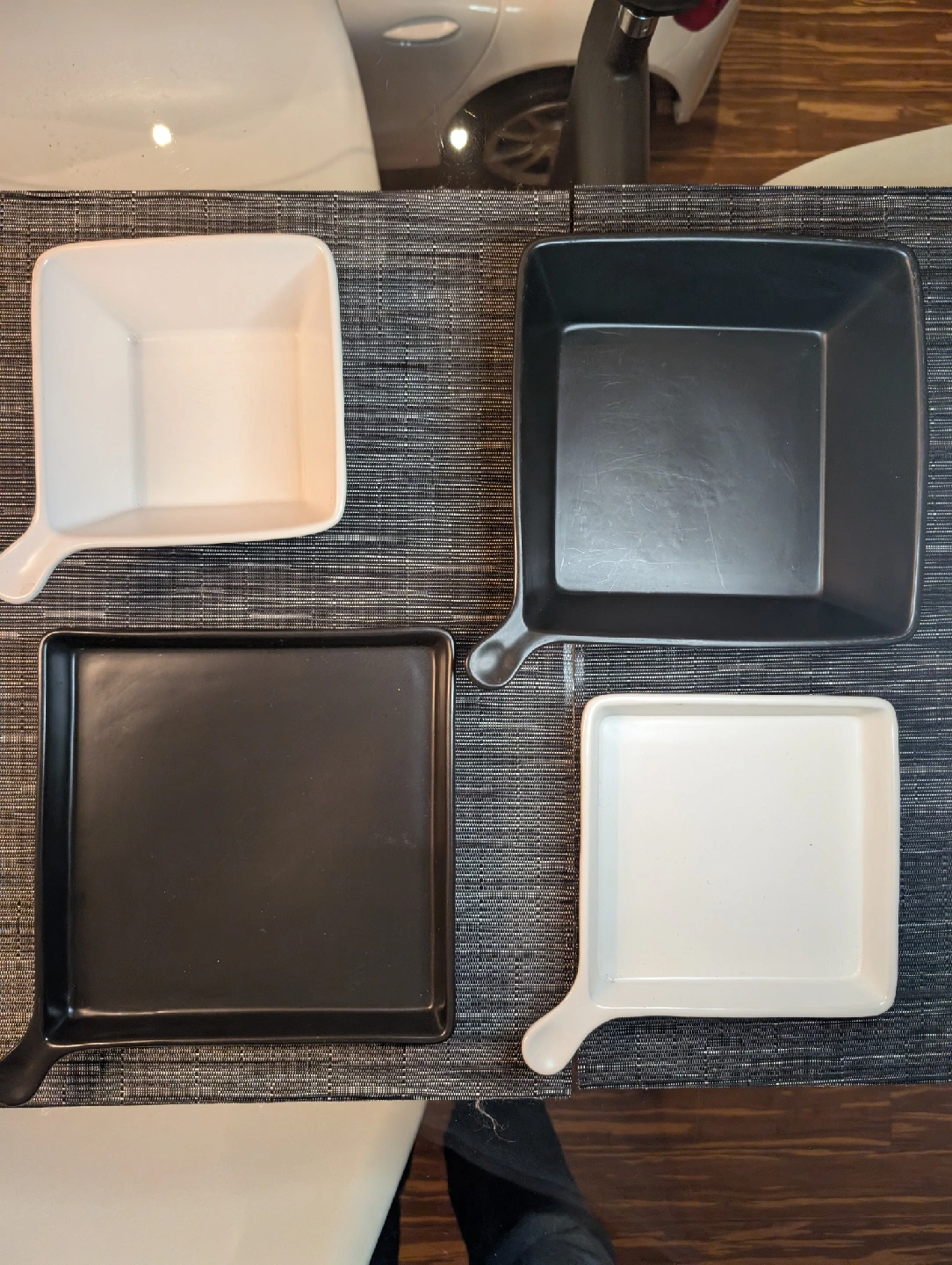 Selling a set of square serving dishes! There are two black and two white dishes. Perfect for appetizers or snacks! selling them because barely use them and need to purge there's nothing wrong with them really good dishes