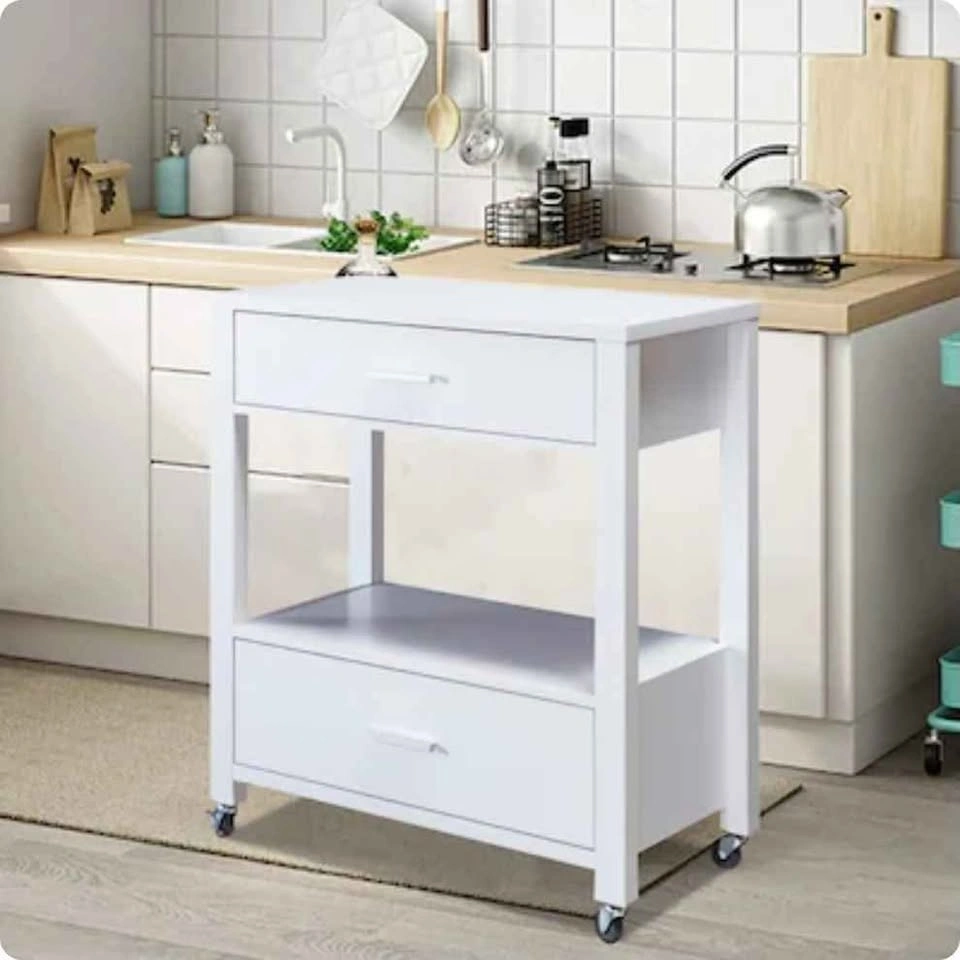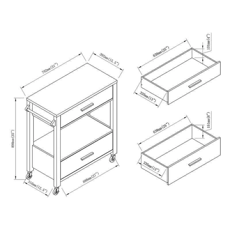 Brand new cart. It comes unassembled in original sealed box with all manufacturer parts and hardware for easy assembly. Also available in Cappuccino colour. Retails at Walmart for $410 + tax. Furniture of America Arton Contemporary Wood 2-Drawer Kitchen Bar Cart with Two Drawers in White Product details: A crisp silhouette lends classic charm to this contemporary cappuccino wood kitchen cart. A spacious surface and open shelf provide plenty of space for drinks and barware, while the two drawers offer concealed storage space like foil cutters, corkscrews, and bottle stoppers. This charming kitchen cart is complete with a towel rack and sits atop casters for easy mobility from room to room. Features: Includes: One (1) Kitchen Cart Style: Contemporary Finish: White Materials: MDF, Particle Board Open bottom shelf Built-in towel rack Four caster wheels Spacious surface Convenient two (2) drawers on metal glides Easy to follow step by step assembly guide included Specifications: Product Dimensions: 31.25"W x 15.5"D x 35"H Weight Capacity: 50 lbs. Product Weight: 52 lbs. Assembly Required: Yes