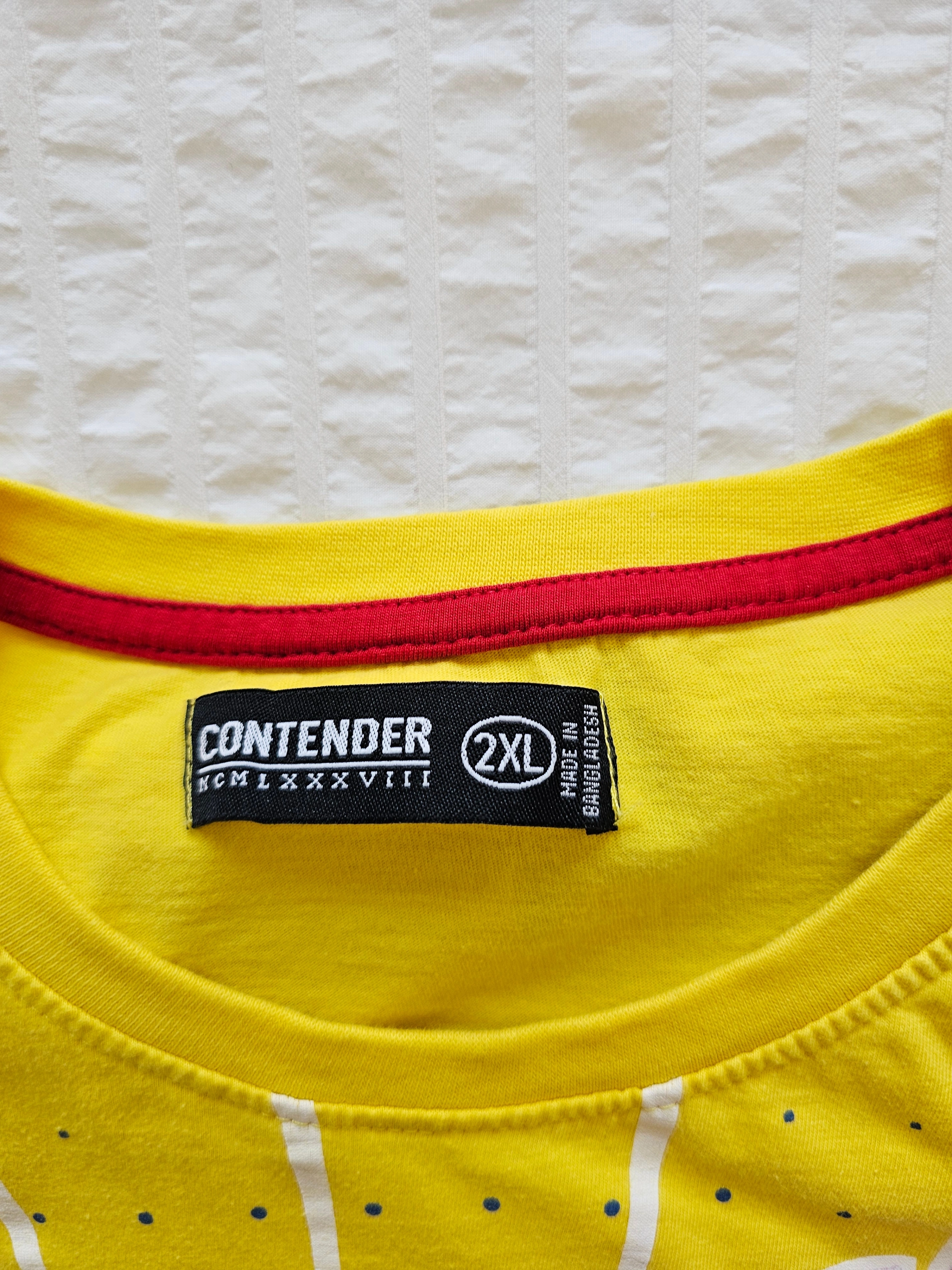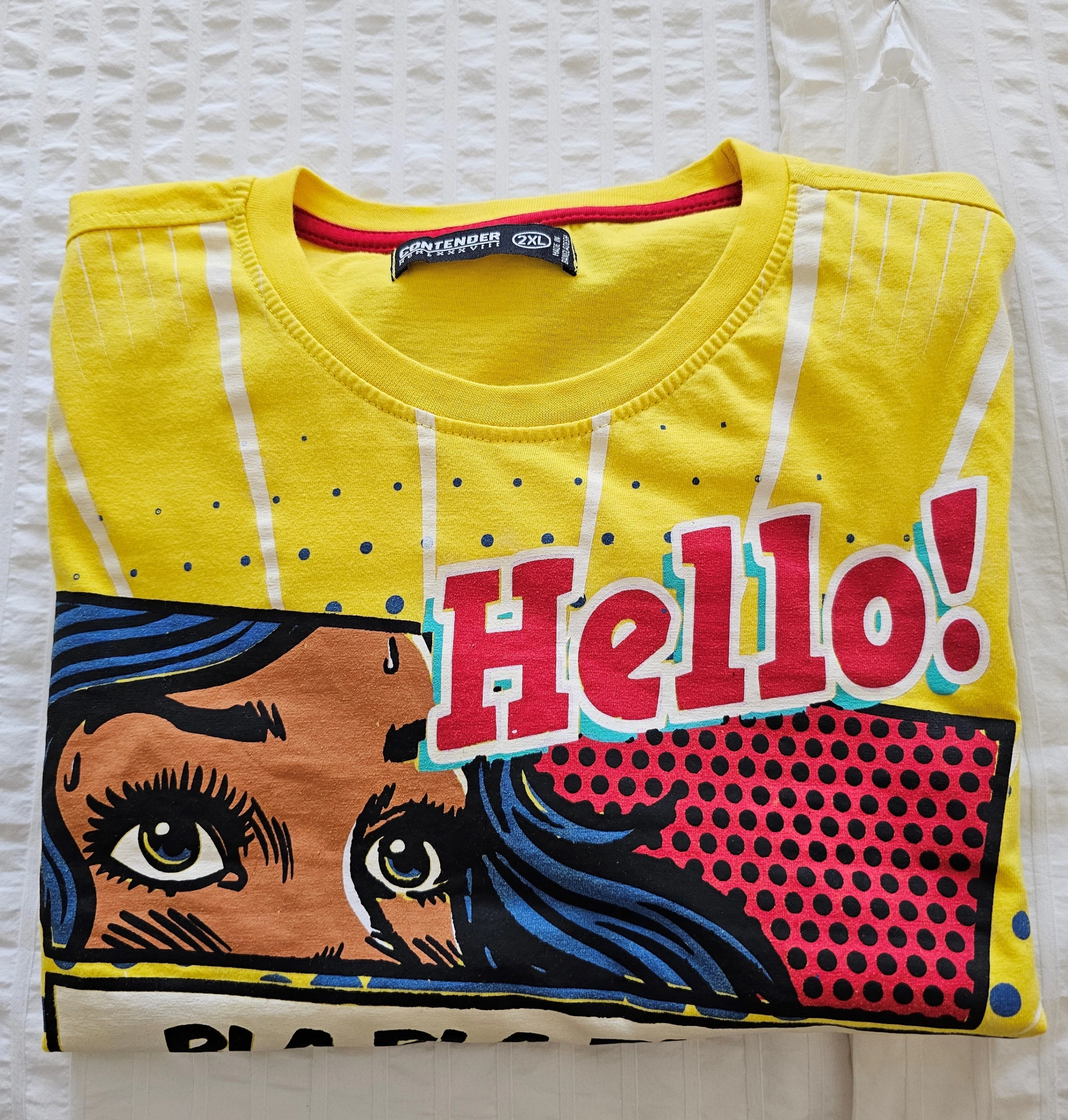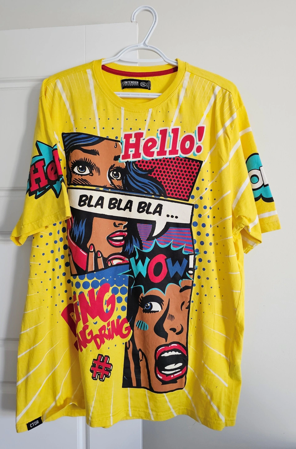 ~ IN THE SOUTH SURREY/WHITE ROCK AREA ~ You get a LIKE New, "CONTENDER" MCMLXXXVIII Limited Edition Unisex Designer T-Shirt in Bright Yellow Colour in Great condition! ~ Bright T-Shirt with Large "HELLO!" & "BLA BLA BLA" graphics logo on the front of the shirt, & large "HELLO!" & "OMG!" graphics on each sleeve. ~ An Amazing looking shirt at a GREAT PRICE!!! ~ In great clean, Worn Once & then hung in closet condition. ~ The size is slightly Fitted at 2XL, but will also fit Large to Extra Large. ~ No tax to pay or shipping. ~ Cash Only & you pick up. ~ REASONABLE OFFERS CONSIDERED, LOW BALL OFFERS WILL BE IGNORED!!! ~ Serious Buyers & No Low Ballers please. *** NOTE *** Please see my other listings as I am currently selling many household items such as Queen Size Pillow Cases and Duvet Covers, Backpacks, Bathroom Mats, Duffle Bags, Suitcases, Shoe Storage, Lots of various sizes of BRAND New Picture Frames and also BRAND NEW, NEVER WORN SNEAKERS etc.