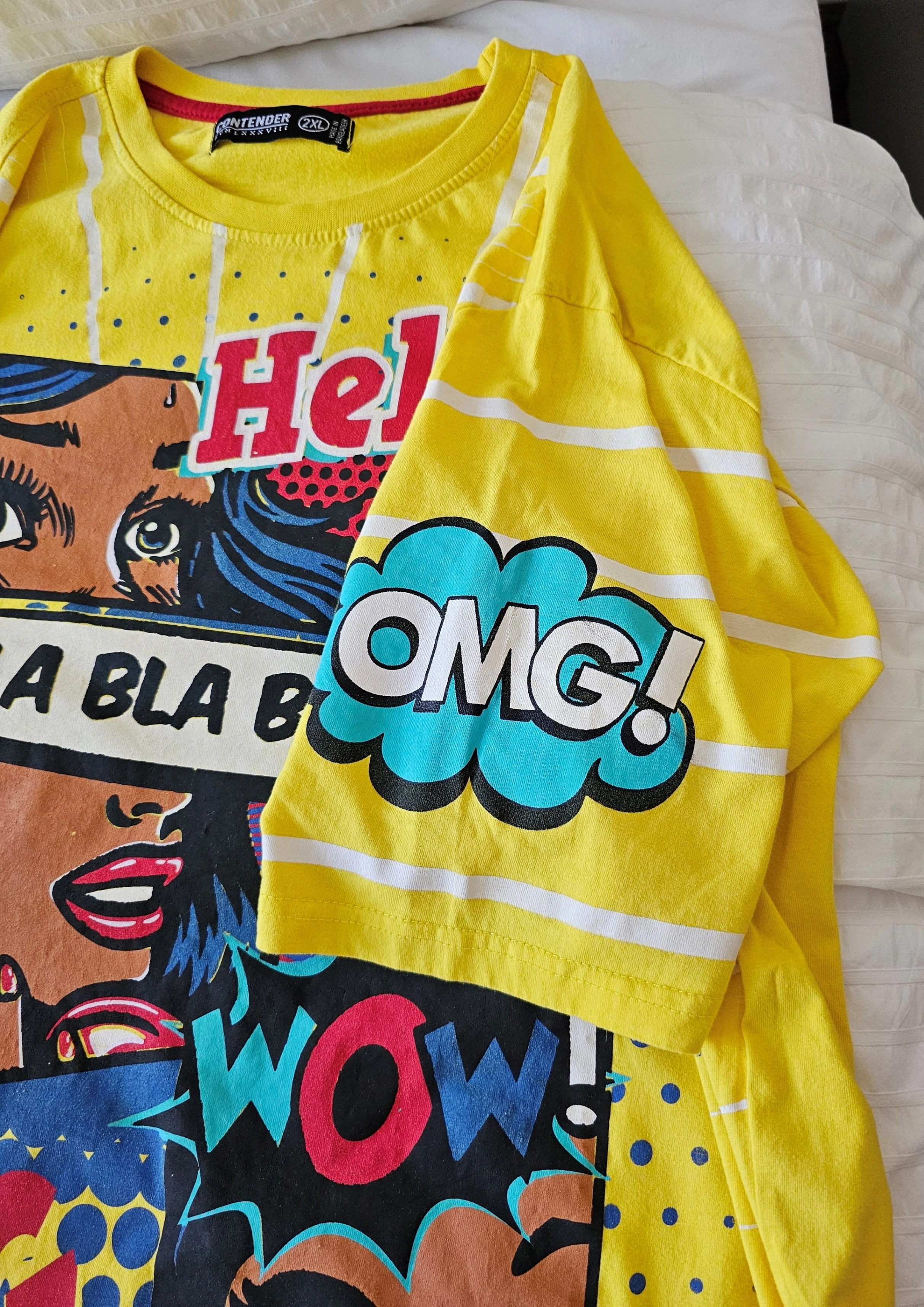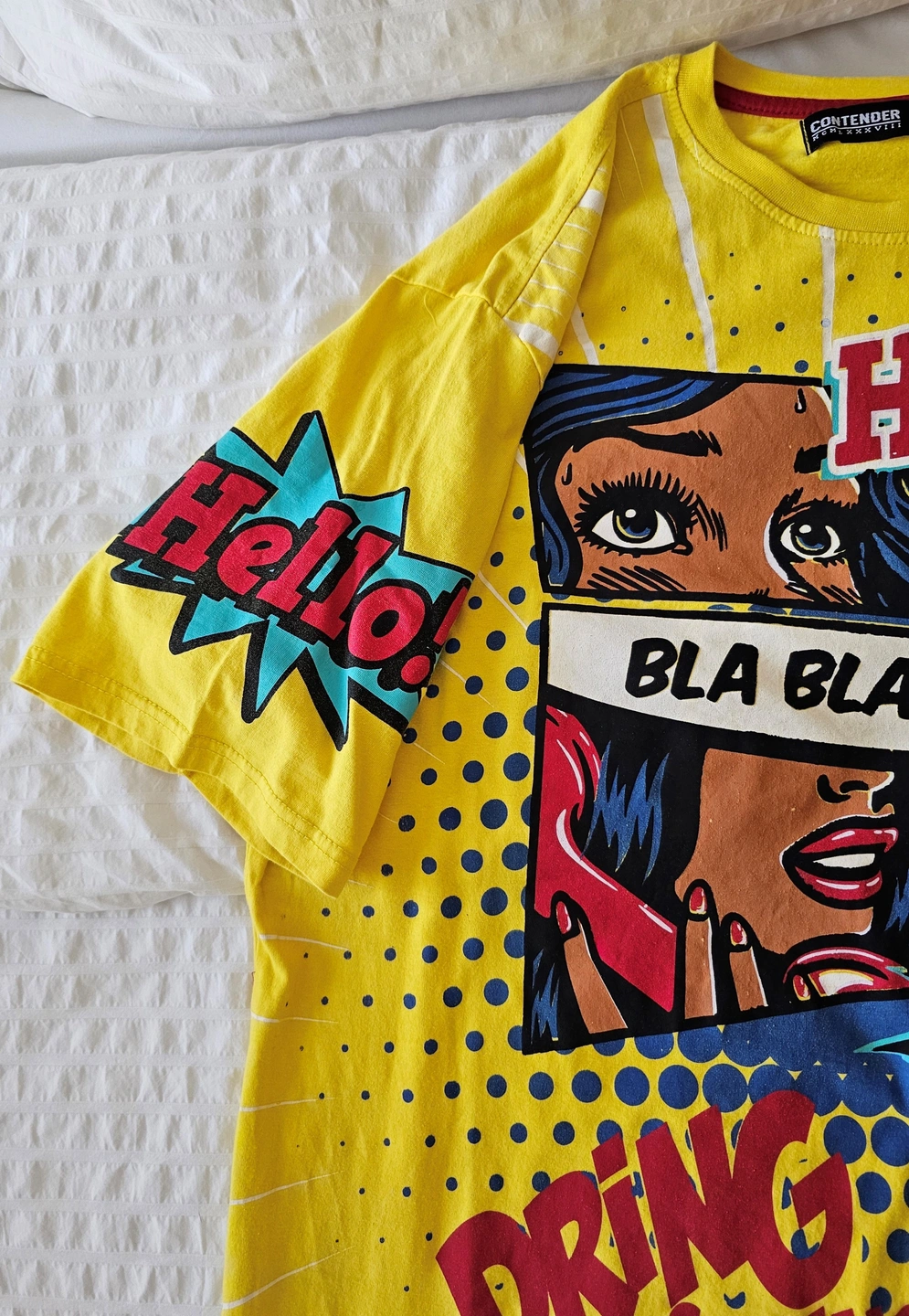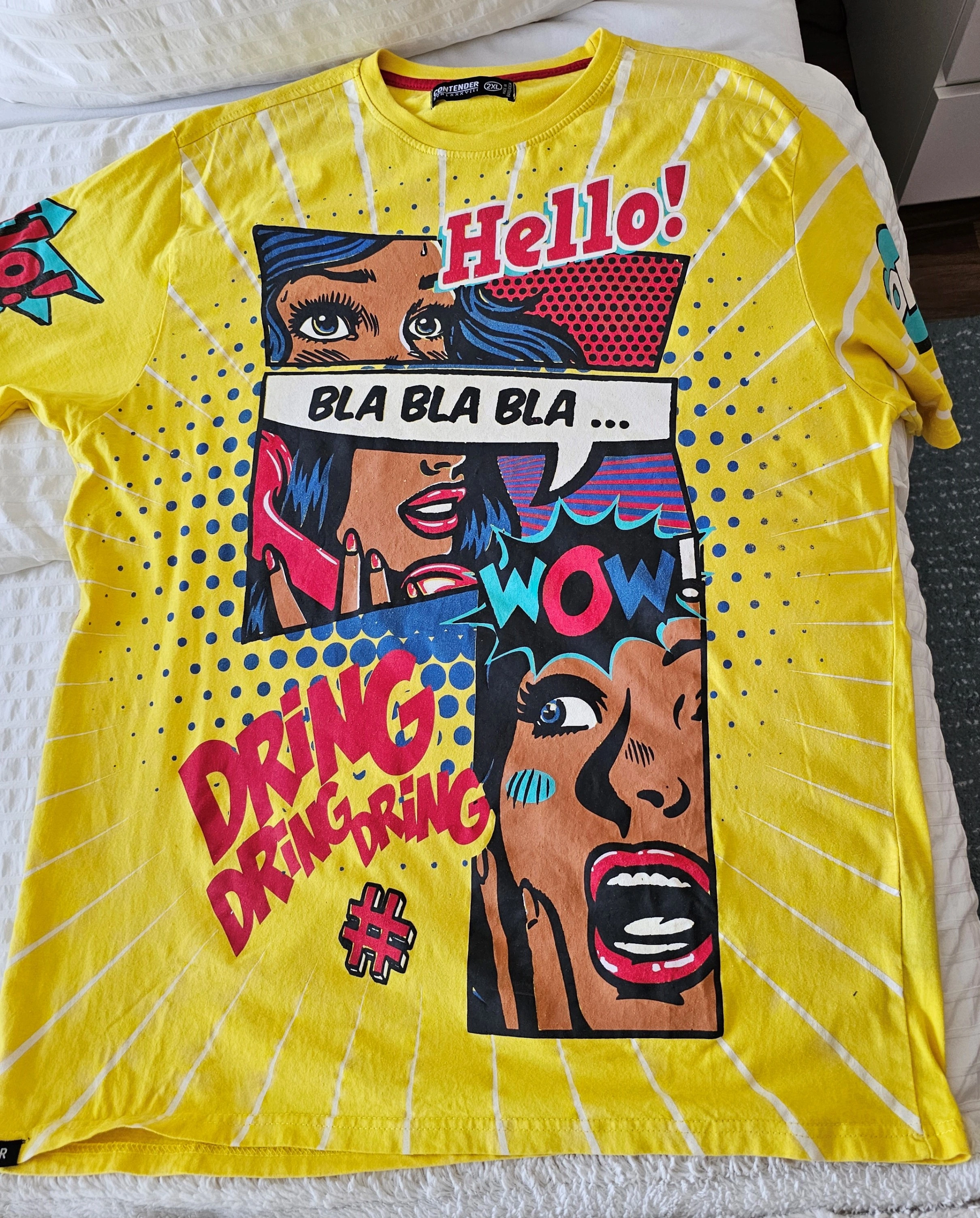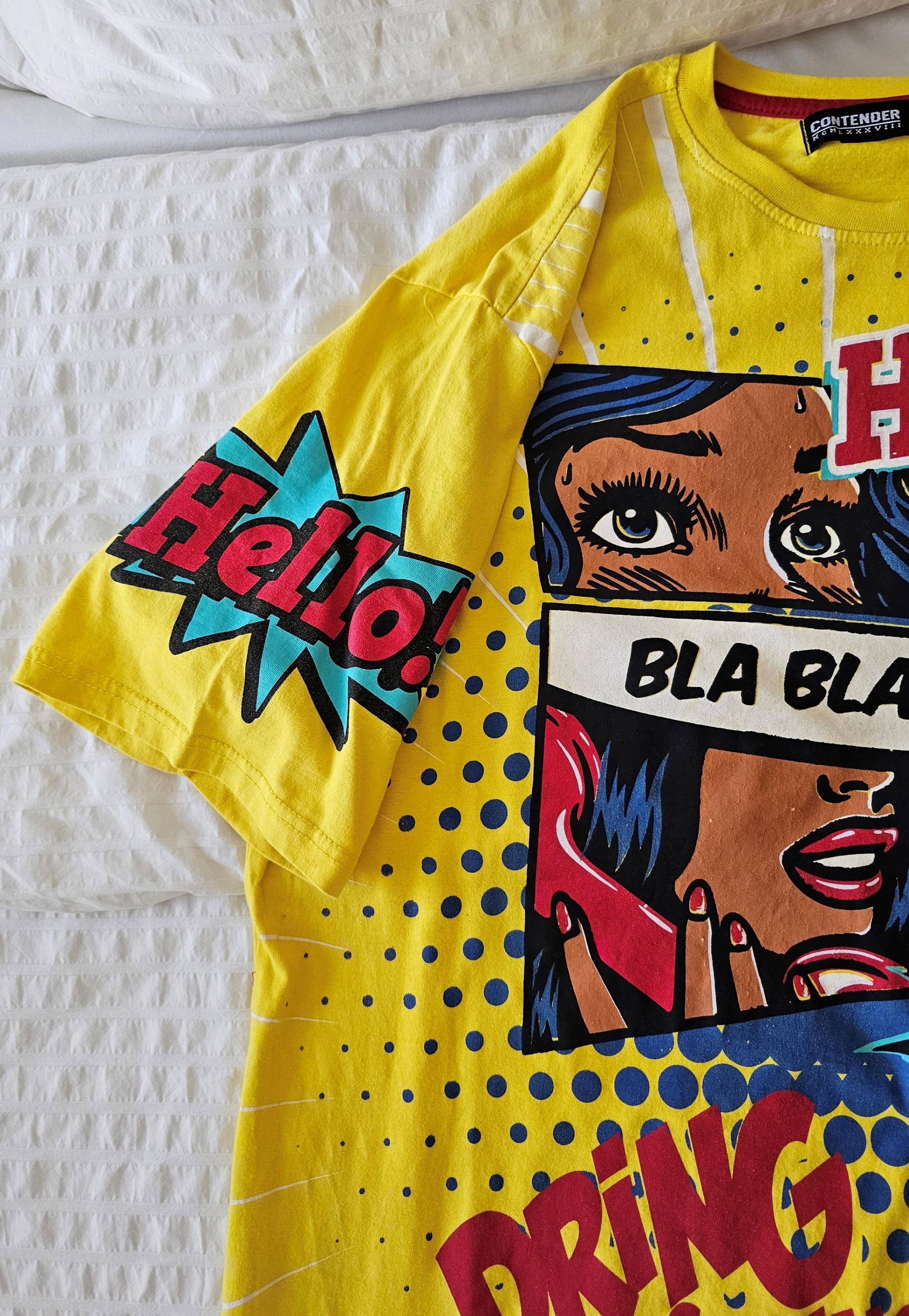 ~ IN THE SOUTH SURREY/WHITE ROCK AREA ~ You get a LIKE New, "CONTENDER" MCMLXXXVIII Limited Edition Unisex Designer T-Shirt in Bright Yellow Colour in Great condition! ~ Bright T-Shirt with Large "HELLO!" & "BLA BLA BLA" graphics logo on the front of the shirt, & large "HELLO!" & "OMG!" graphics on each sleeve. ~ An Amazing looking shirt at a GREAT PRICE!!! ~ In great clean, Worn Once & then hung in closet condition. ~ The size is slightly Fitted at 2XL, but will also fit Large to Extra Large. ~ No tax to pay or shipping. ~ Cash Only & you pick up. ~ REASONABLE OFFERS CONSIDERED, LOW BALL OFFERS WILL BE IGNORED!!! ~ Serious Buyers & No Low Ballers please. *** NOTE *** Please see my other listings as I am currently selling many household items such as Queen Size Pillow Cases and Duvet Covers, Backpacks, Bathroom Mats, Duffle Bags, Suitcases, Shoe Storage, Lots of various sizes of BRAND New Picture Frames and also BRAND NEW, NEVER WORN SNEAKERS etc.