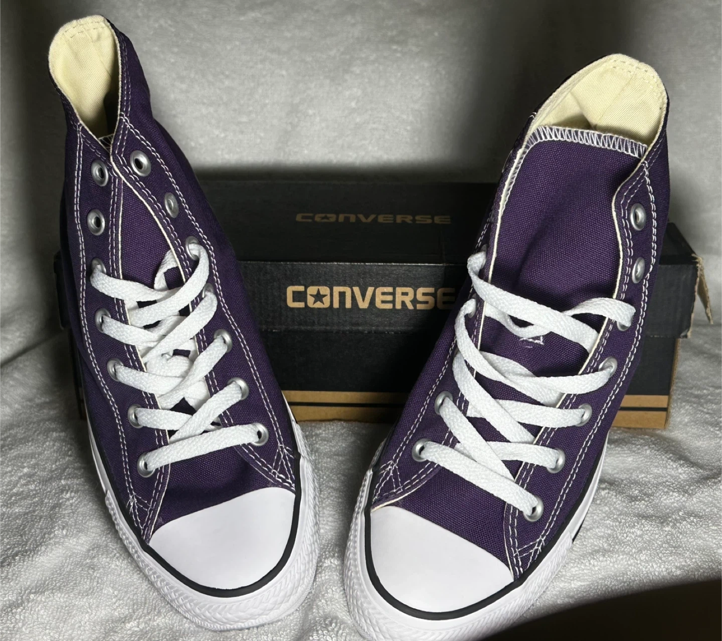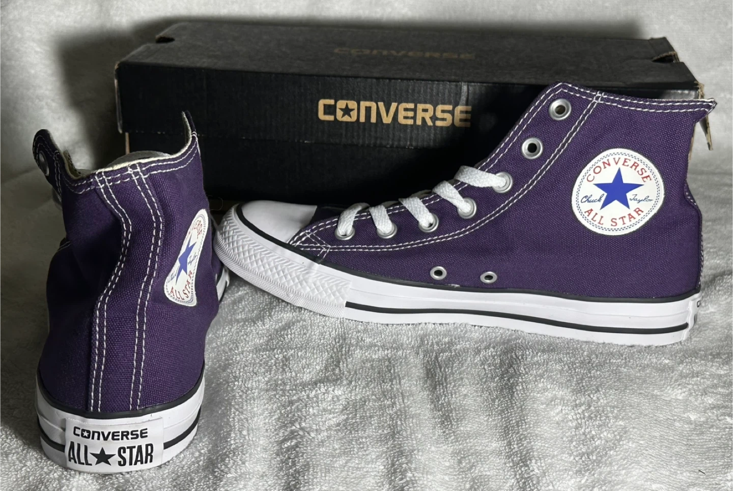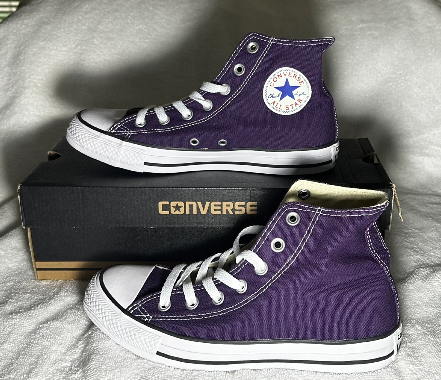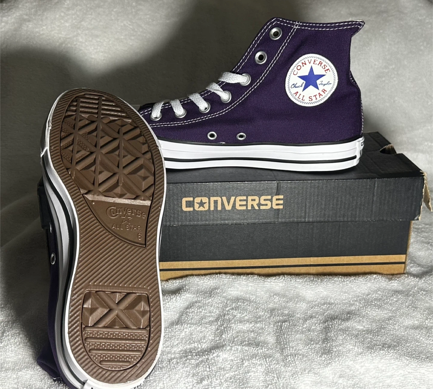 Selling a pair of Converse Chuck Taylor All Star high tops in a lovely purple colour! They come with the original box. These classic sneakers are brand-new and ready for a new home. A timeless addition to any wardrobe! Original price $60.00