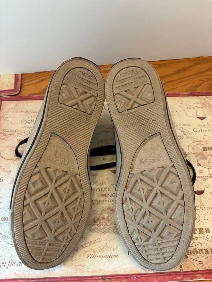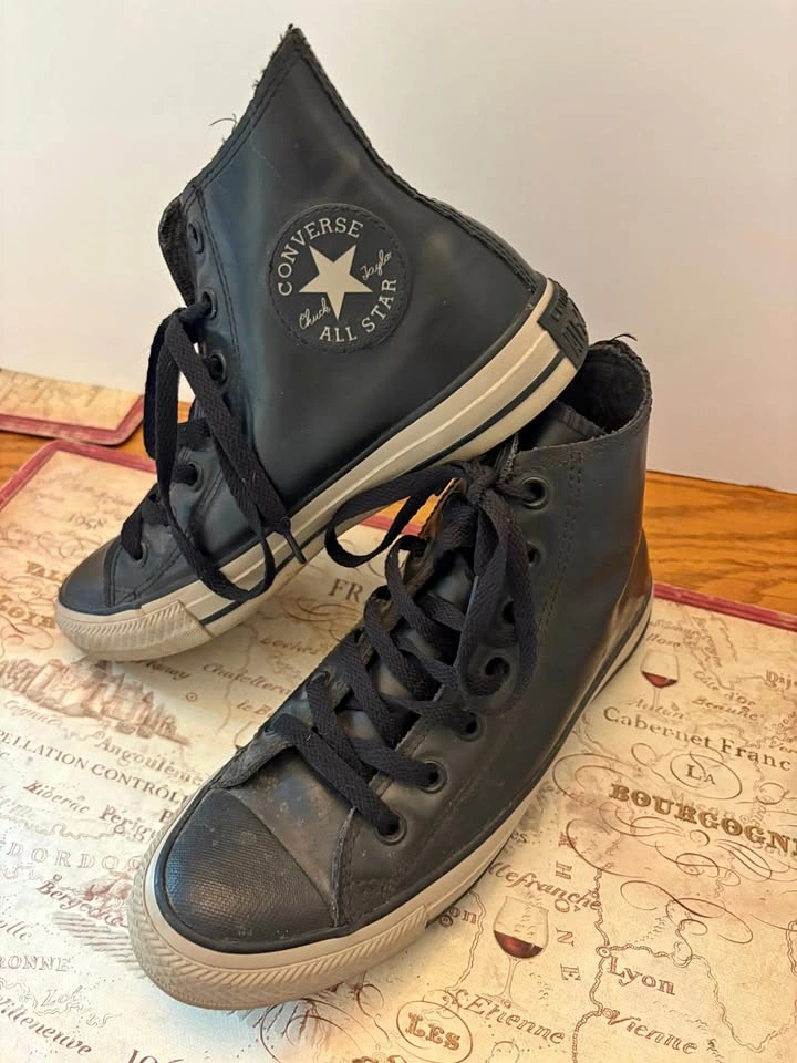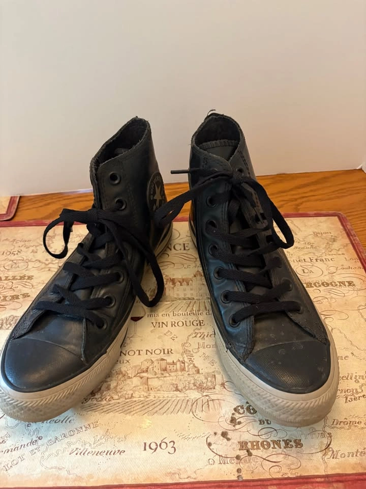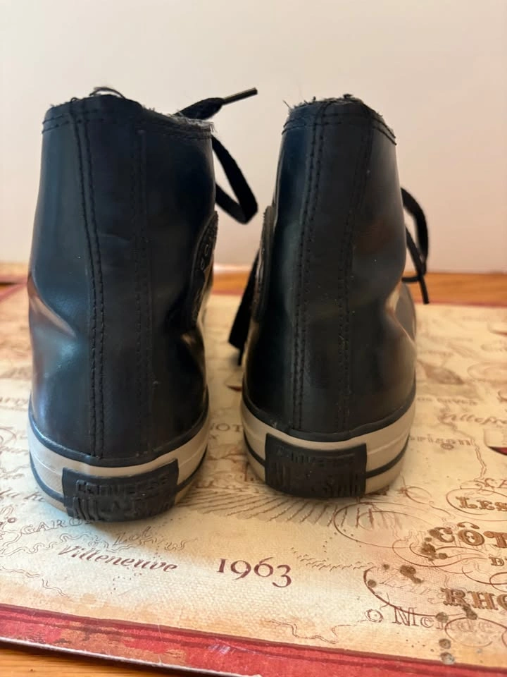 Selling a pair of black Converse Chuck Taylor All Star high-top sneakers with a rubber upper, which makes them great for wet weather. They have a classic look with a rubber toe cap and a tan-colored sole. These are a men's size 9.5 and are in good condition.