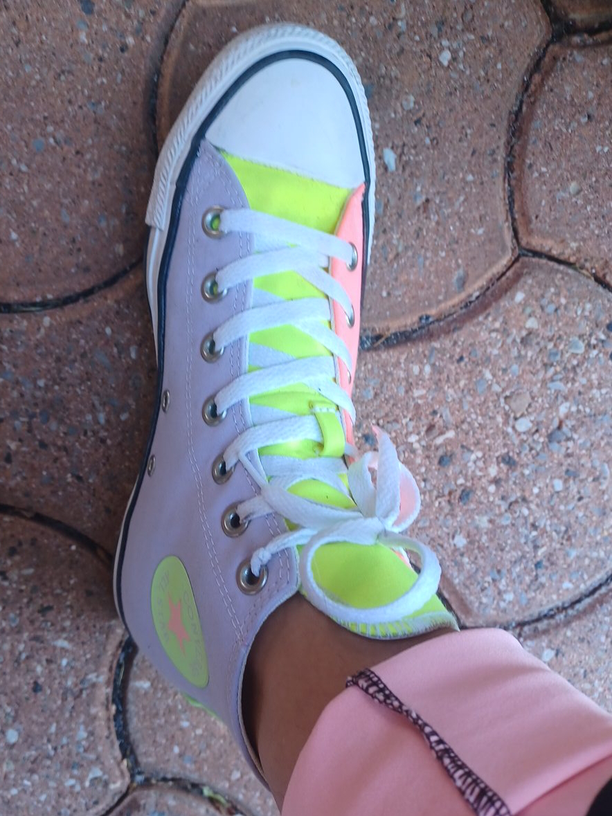 Selling a pair of Converse high top sneakers. They have a unique colour block design with shades of lilac, neon yellow, and peach. Great for adding a pop of colour to your outfit!