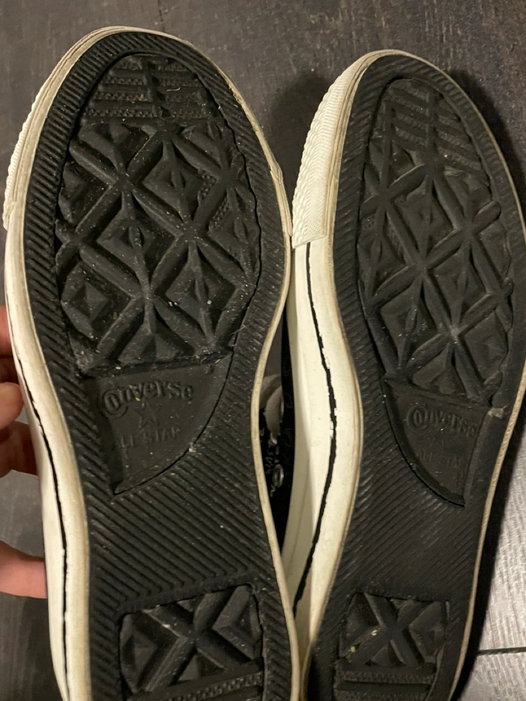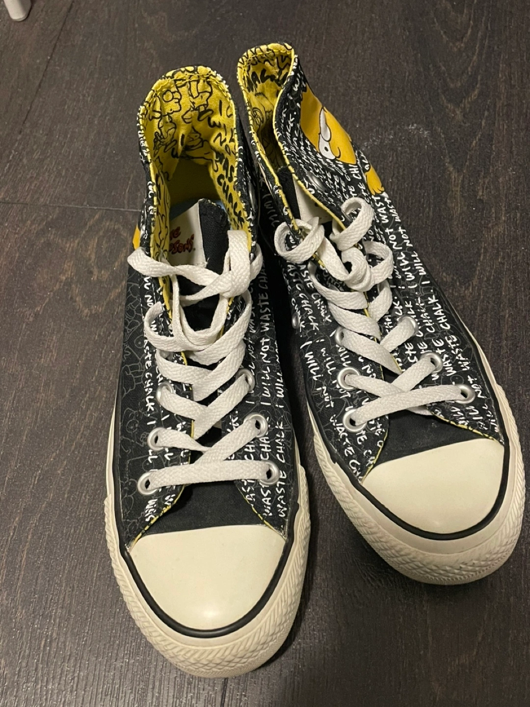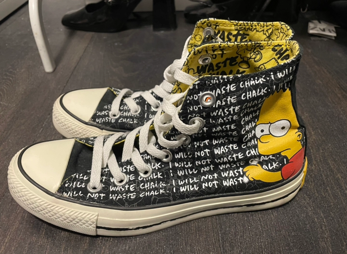 Pair of black Converse high-top sneakers. Simpsons Bart Simpson theme. Yellow and black print. Chalkboard design. Pre-owned.