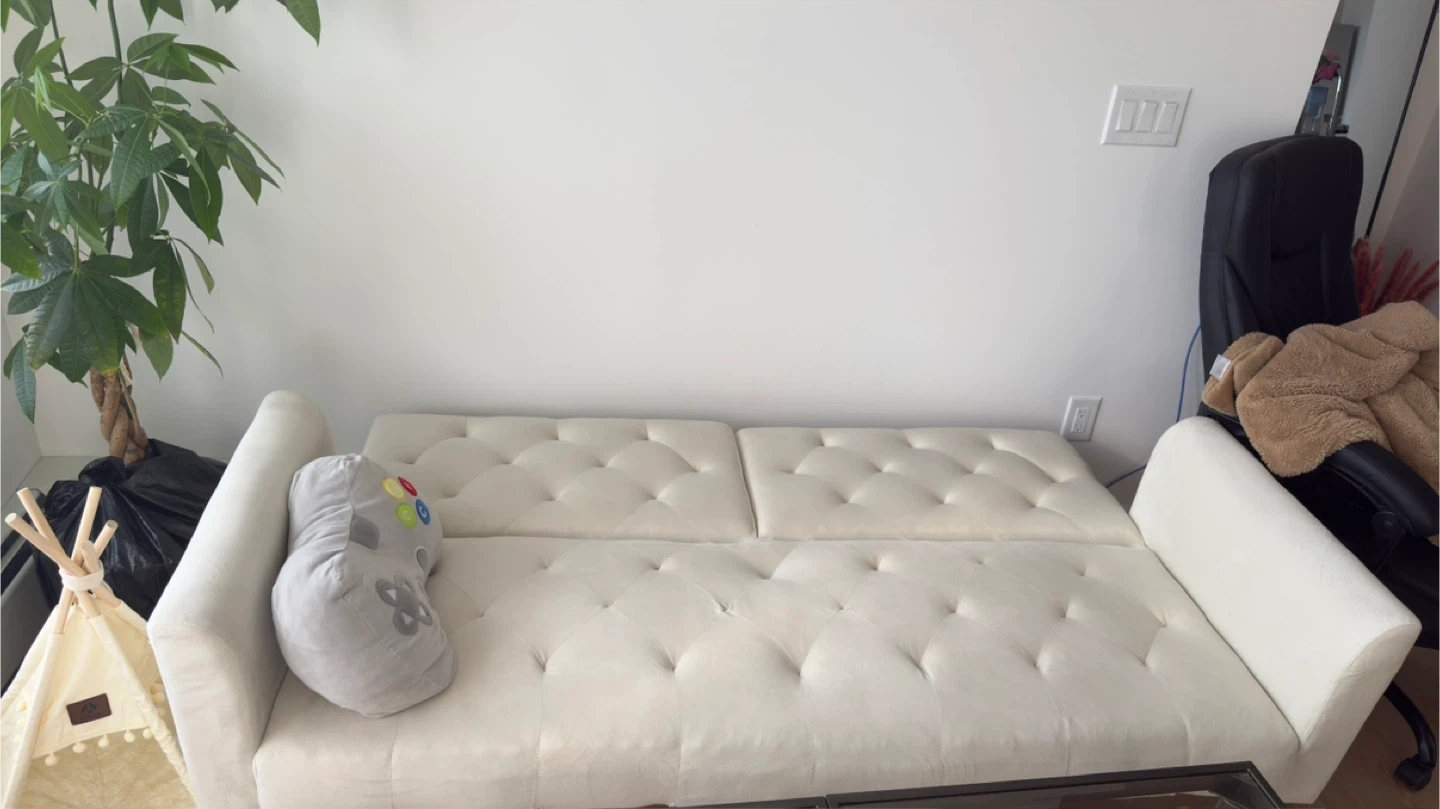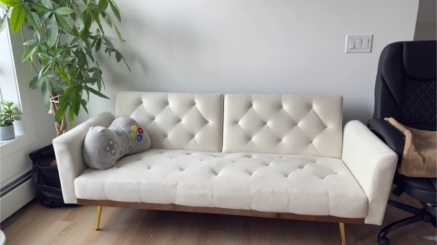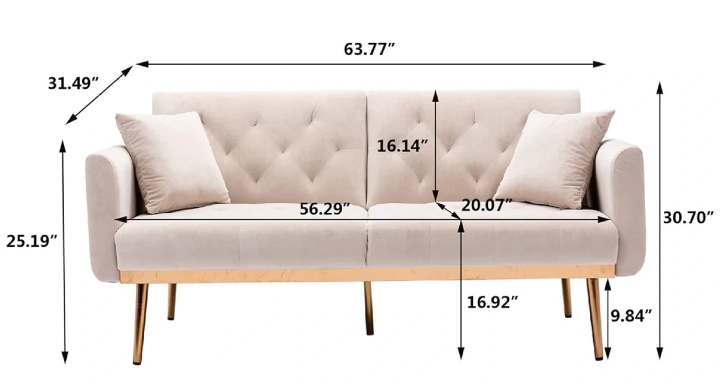 This convertible futon sofa bed is perfect for small spaces. It easily converts from a sofa to a bed, making it ideal for guests or for use in a studio apartment. The dimensions are approximately 63.77" in width, 30.70" in height, and 31.49" in depth. The seat height is 16.92". The sofa features a button-tufted design and is supported by stylish gold-tone legs