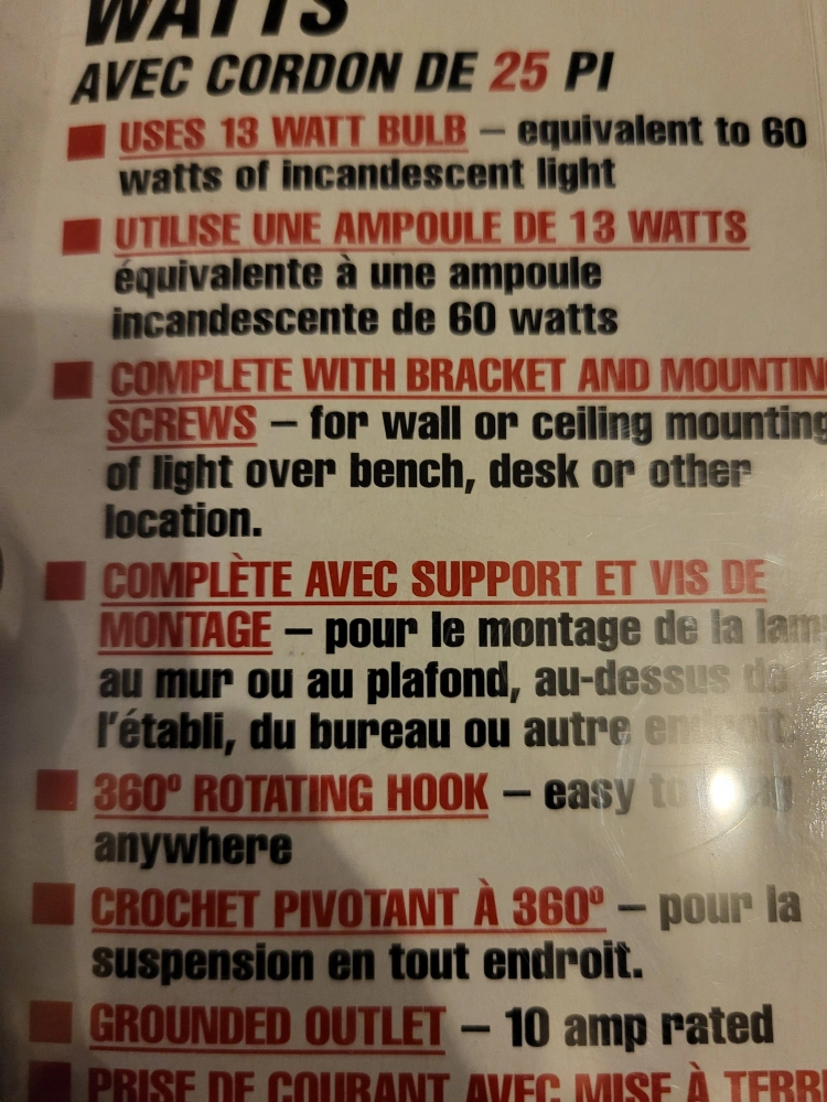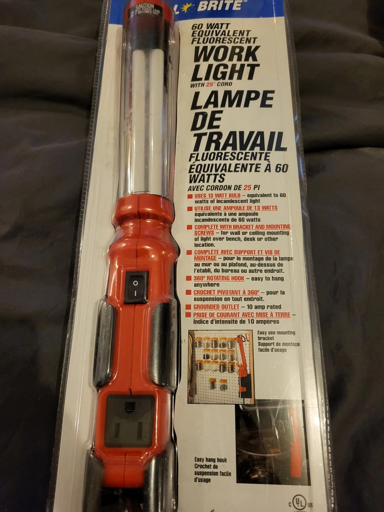 Selling a Cool Brite fluorescent work light! **Brand New in pkging. It's equivalent to 60 watts and uses a 13-watt bulb. It comes complete with a bracket and mounting screws for wall or ceiling mounting. It also features a 360° rotating hook for easy hanging anywhere and a grounded outlet rated at 10 amps
