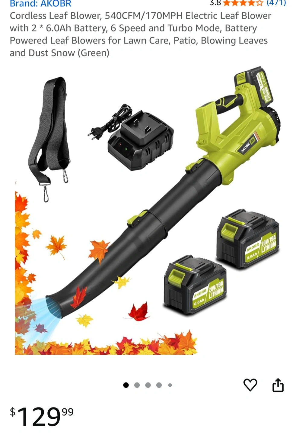 Selling an AKOBR cordless leaf blower in excellent condition! It comes with two 6.0Ah batteries, a charger, and a handy shoulder strap. The blower features 6 speeds and a turbo mode for tackling any job. It's perfect for lawn care, patios, and blowing away leaves and dust. The original box is included.