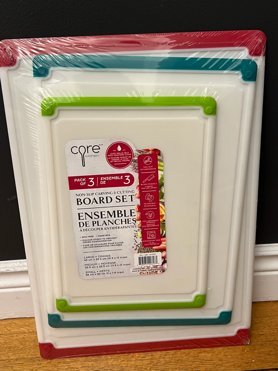 I have a brand new Core Kitchen 3-piece cutting board set for sale! It includes three different sized boards: - Large: 43 cm x 30.5 cm (16.9 x 12 in) - Medium: 35.5 cm x 25.5 cm (13.9 x 10 in) - Small: 28 cm x 20 cm (11 x 7.8 in) They are colour-coded to prevent cross-contamination and are dishwasher safe