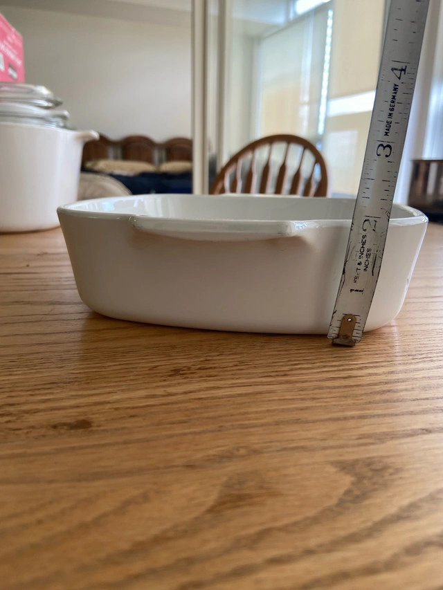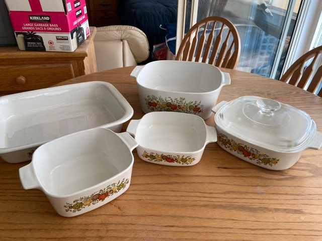 This set of used Corelle casserole dishes feature the popular vegetable pattern and includes various sizes for all your cooking needs. The dishes are in good condition, perfect for baking and serving. Included: - One large rectangular dish - One medium square dish - One small square dish - One medium rectangular dish with lid - One large square dish These vintage pieces are not only functional but also add a touch of retro charm to your kitchen