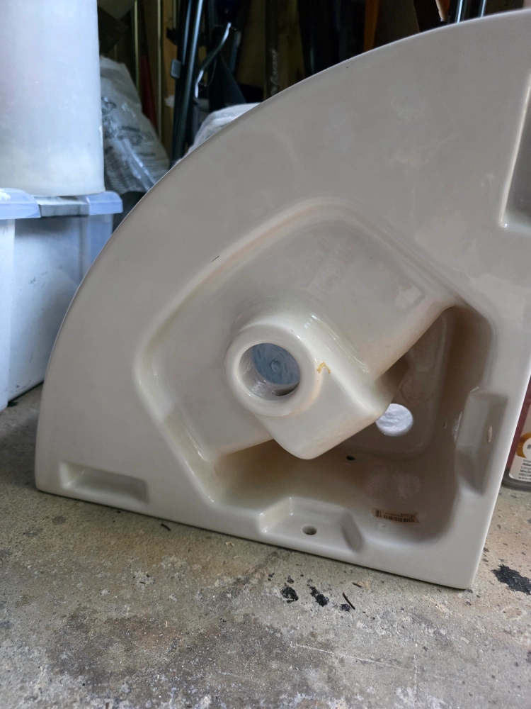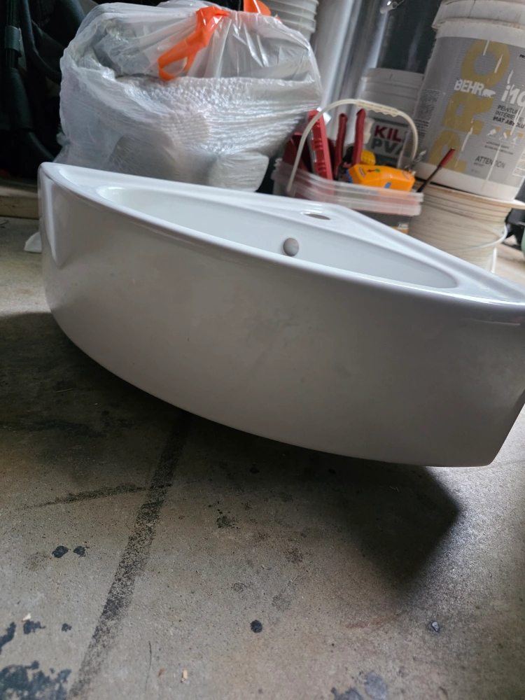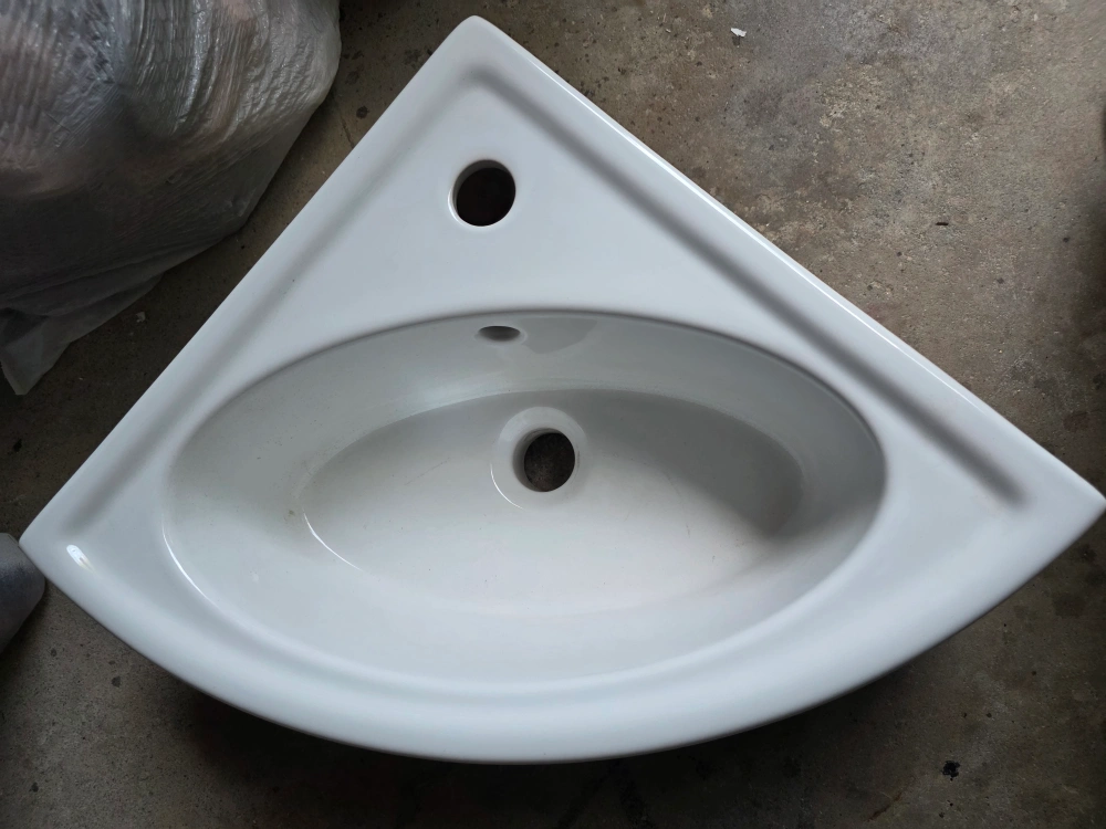 Selling a corner bathroom sink. It's white and in good condition, ready for your bathroom renovation project! It has a unique triangular design.