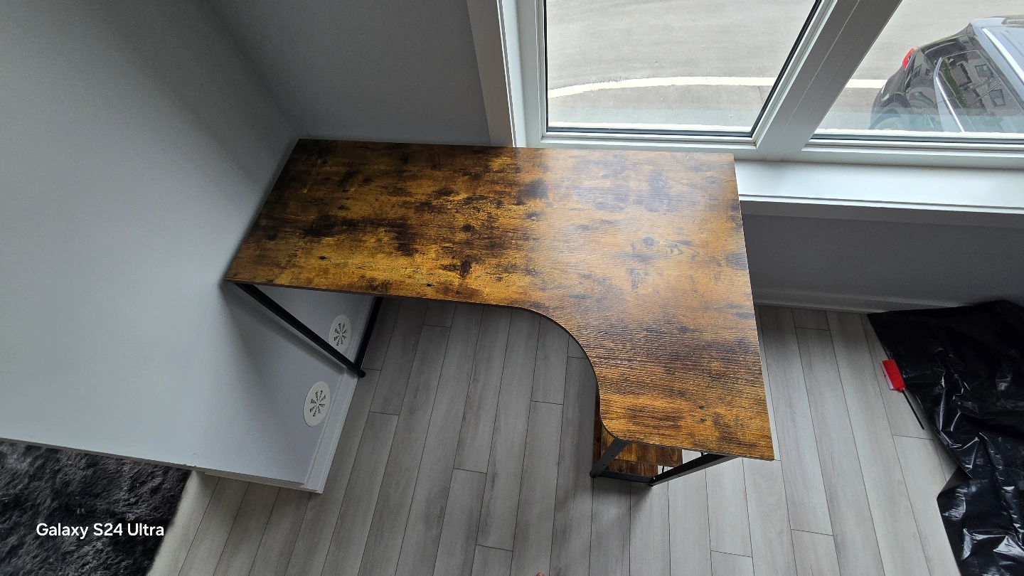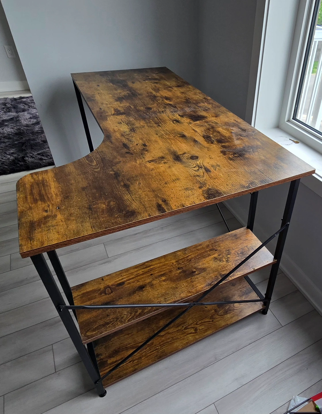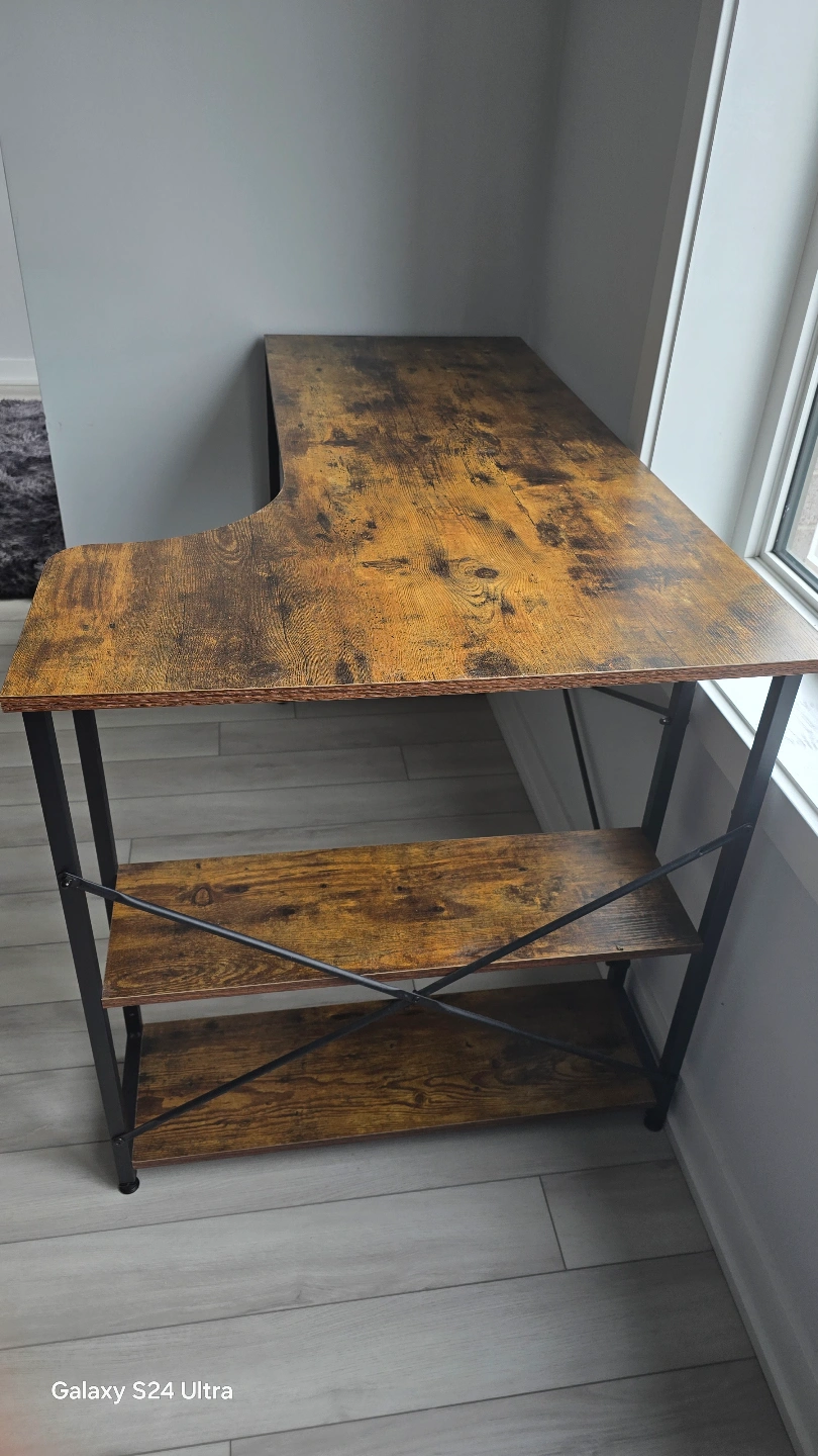 L-shaped desk, brown wood grain top, black metal frame. Two lower shelves for storage. Good for home office or small spaces. Upgrade your workspace with this high-quality office table, perfect for working from home, gaming, or studying. ✅ Sturdy wooden top with strong metal legs ✅ Spacious surface – fits dual monitors, laptop, keyboard, and more ✅ Ideal for home office, student desk, or gaming setup ✅ Clean and well-maintained 💰 Price: CAD $70 📍Pickup in Stittsville