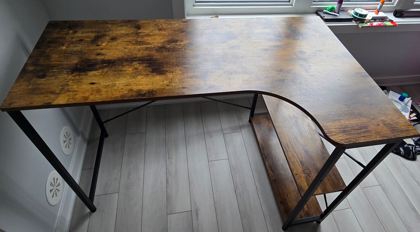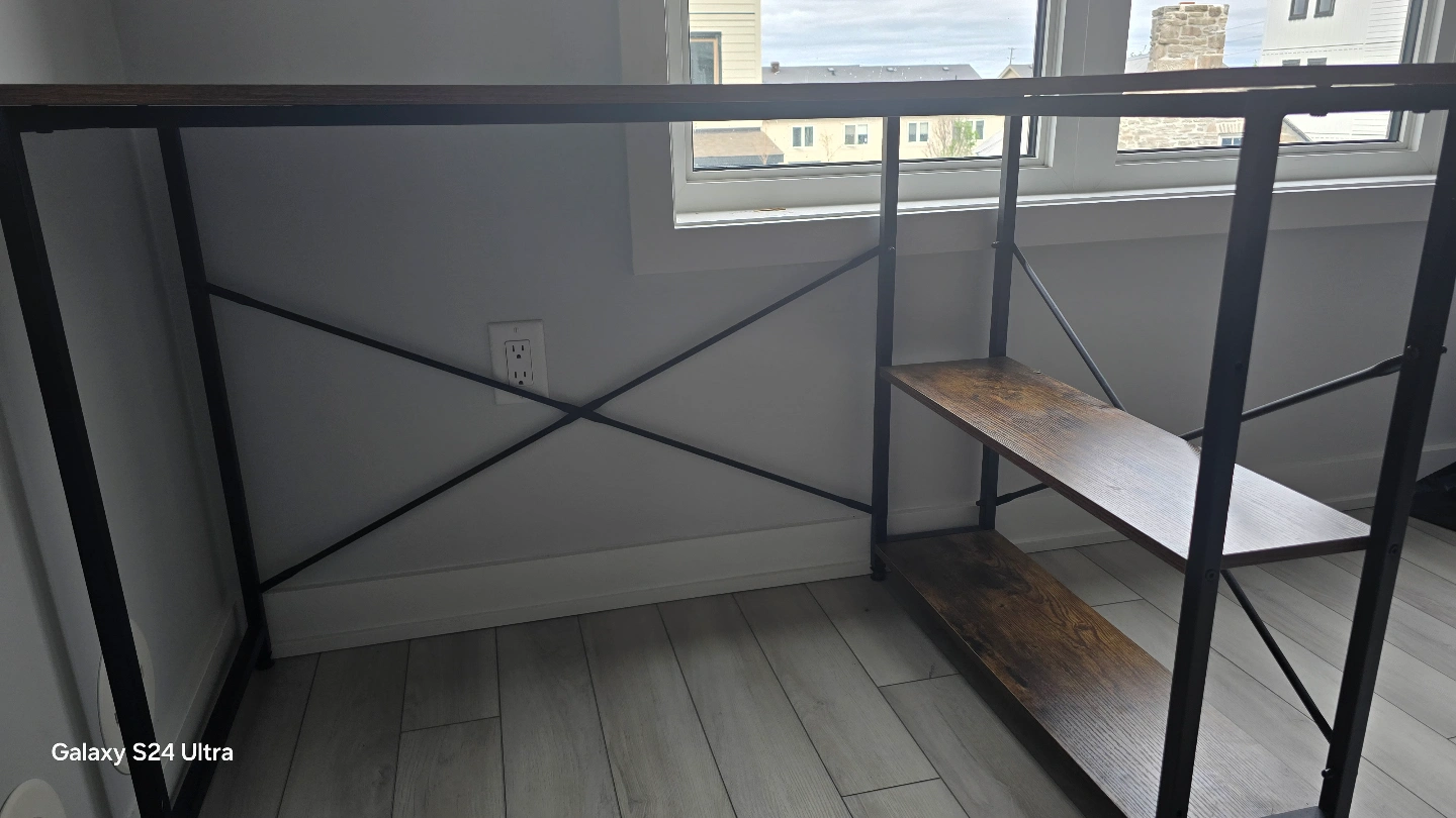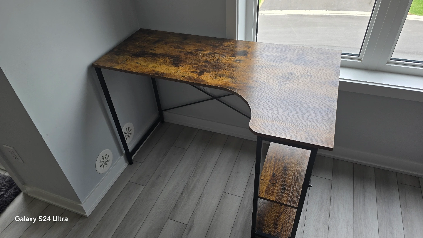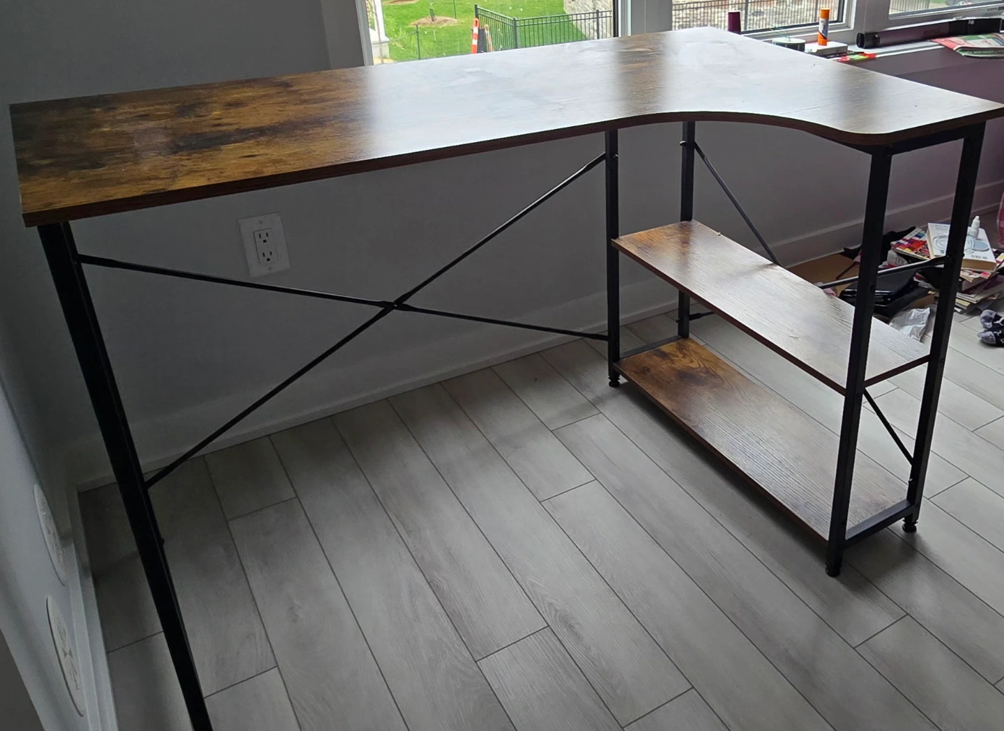 L-shaped desk, brown wood grain top, black metal frame. Two lower shelves for storage. Good for home office or small spaces. Upgrade your workspace with this high-quality office table, perfect for working from home, gaming, or studying. ✅ Sturdy wooden top with strong metal legs ✅ Spacious surface – fits dual monitors, laptop, keyboard, and more ✅ Ideal for home office, student desk, or gaming setup ✅ Clean and well-maintained 💰 Price: CAD $70 📍Pickup in Stittsville