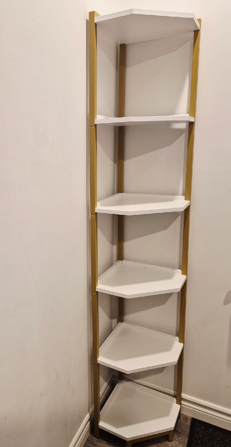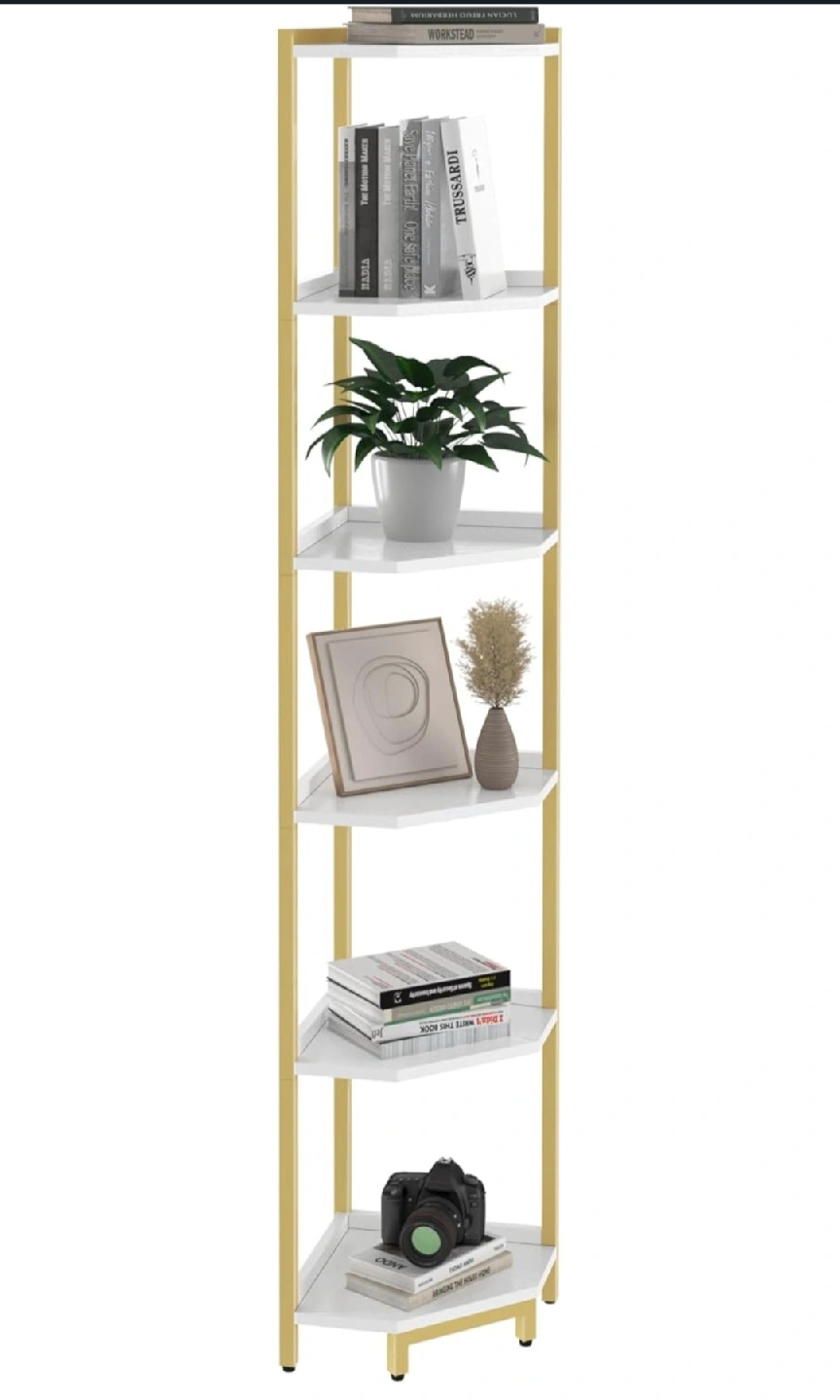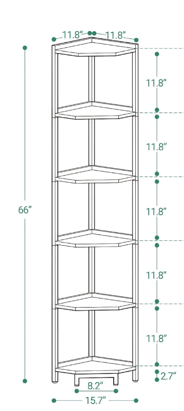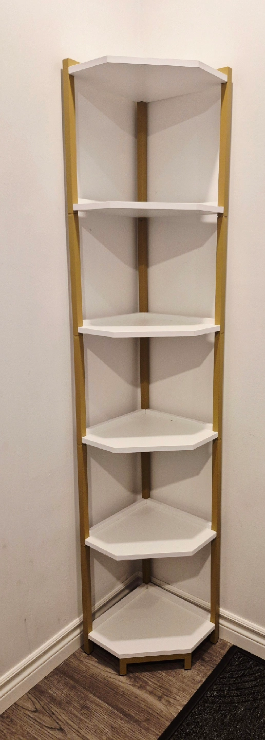 This corner shelf stand works well as a bookshelf, display stand, or plant shelf in any room of your home. Offers ample storage space while taking up minimal floor space. 66" tall.