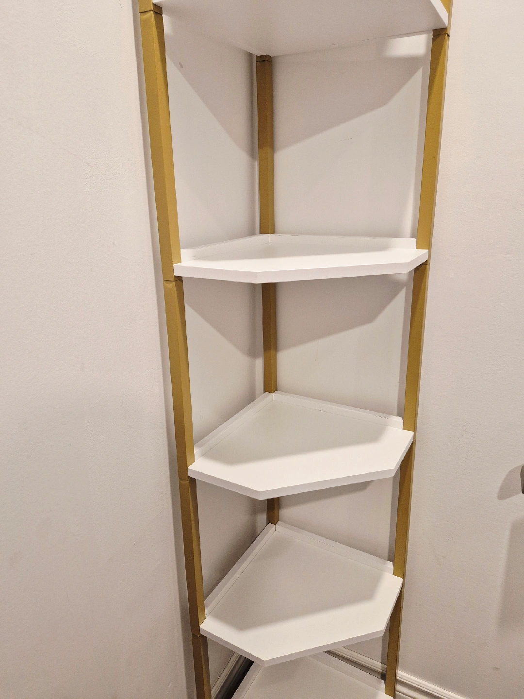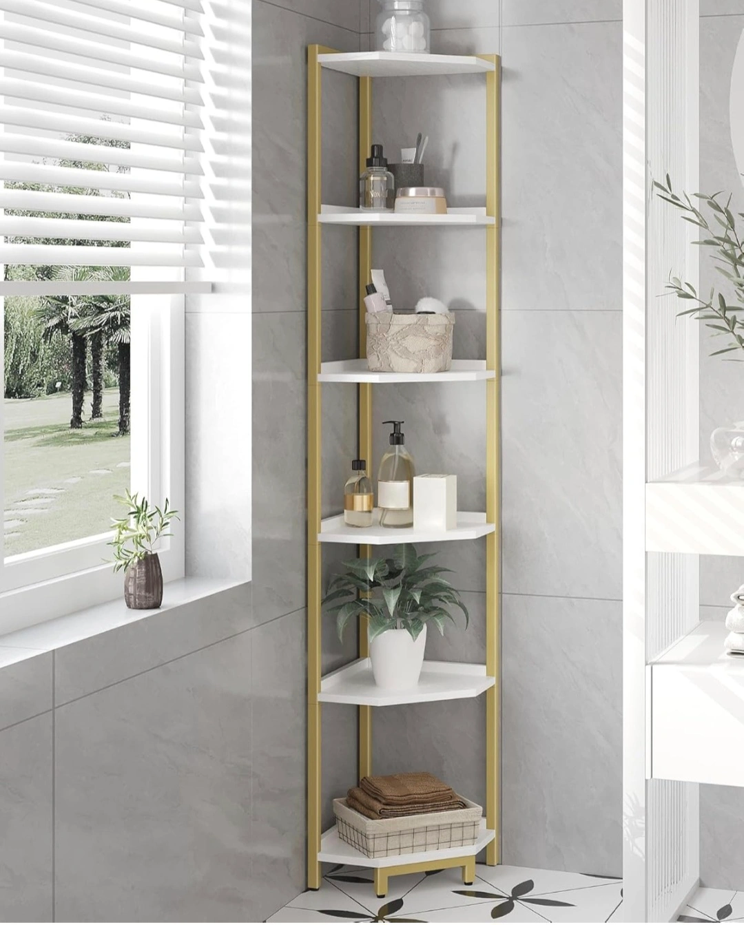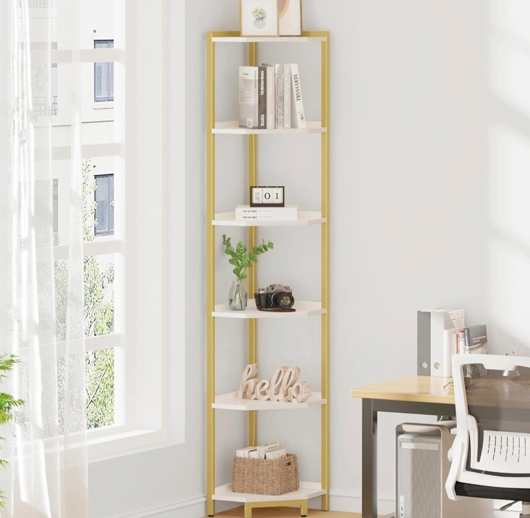 This corner shelf stand works well as a bookshelf, display stand, or plant shelf in any room of your home. Offers ample storage space while taking up minimal floor space. 66" tall.