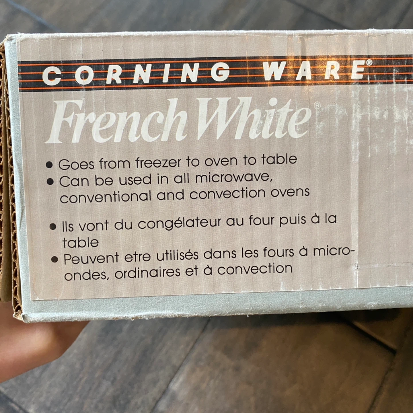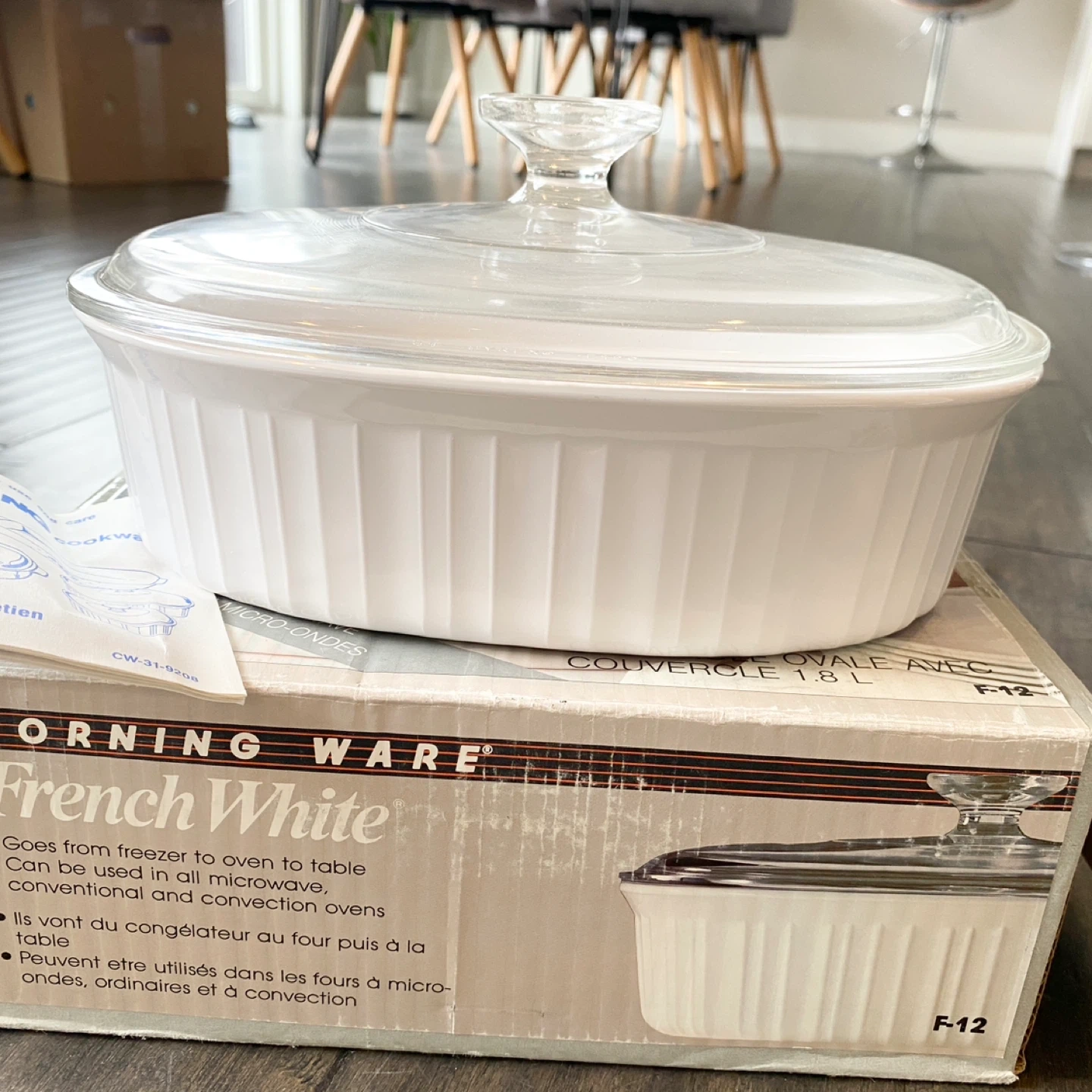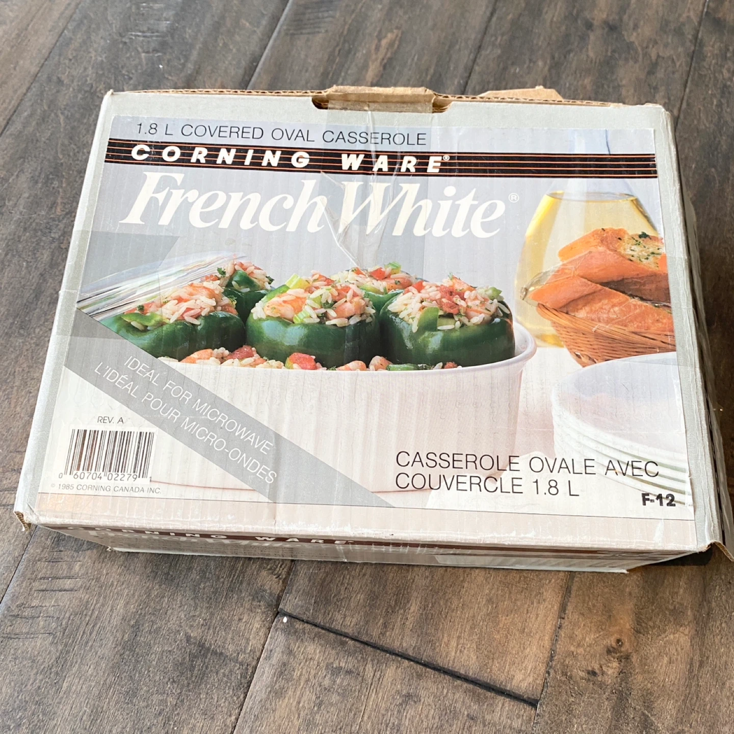Corning ware - french white oval casserole with Pyrex Lid - Vintage from 1985 - New in Open box. Pick up only in Aspen SW, No delivery